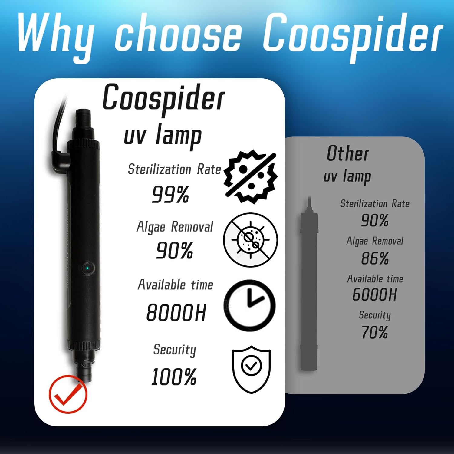 - 【99% Rate】The aquarium UV light utilizes 254nm short-wave UV/UVC germicidal lamps, boasting an efficient rate of 99%. It effectively eliminates green algae, ensuring crystal-clear water. The presence of ultraviolet lamps enhances the filtering effect beyond standard filtration.