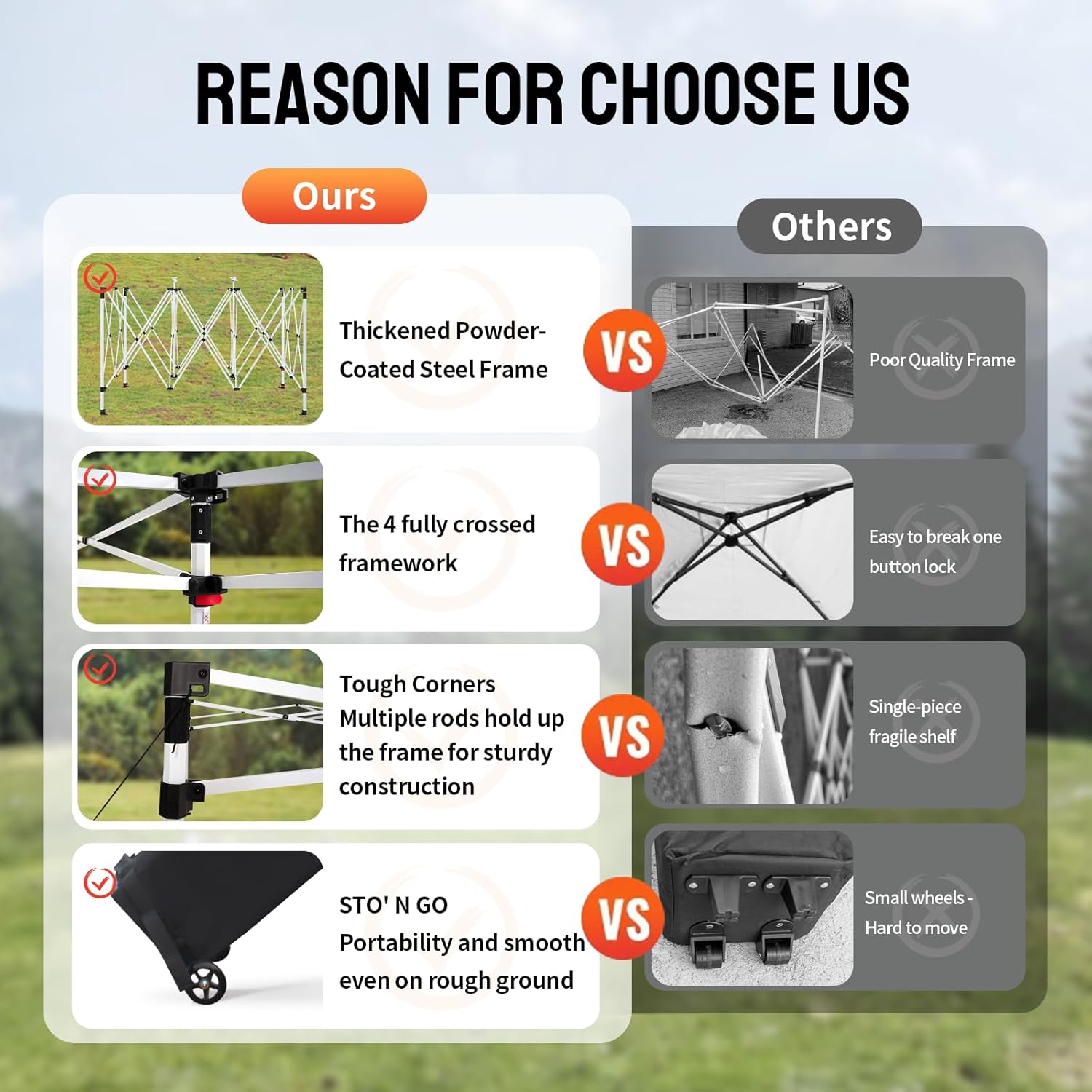 - CONVENIENT ROLLER BAG: This 10x15 pop-up canopy comes with a bag that has 4-inch wheels for easy mobility, featuring a spacious opening and a sturdy pull handle. The convenient pocket design can store 4 stakes and 4 ropes, making this canopy an ideal choice for any outdoor event.
