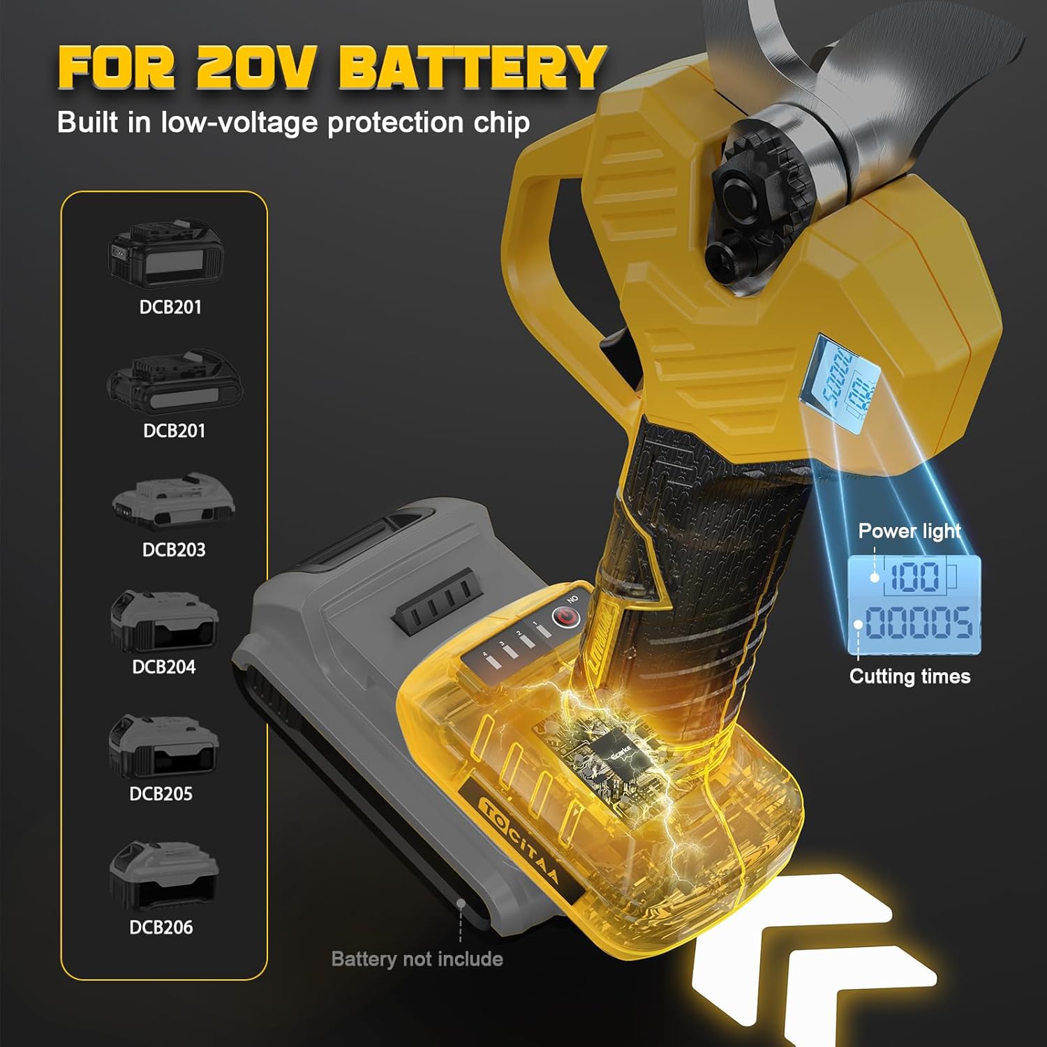 - BATTERY POWERED:TOCiTAA cordless electric pruning shears garden tool for dewalt 18V/20V Lithium-ion batteries DCB206 DCB205 DCB204 DCB181 DCB182 DCB200 DCB203 DCB205-2 DCB204-2 DCB206-2 and more(Battery not included). Easy to use even when there is no power supply outdoors, as long as you bring batteries. And you no longer need to be tethered to an outlet or struggle with tangled cords, making it easy to work in tight spaces, on job sites, or outdoors and family,garden.