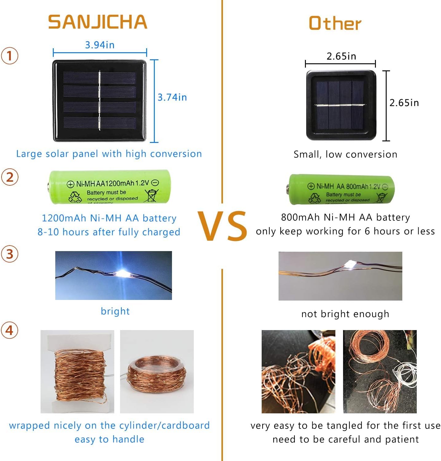 - New Upgraded Solar String Lights Outdoor: Super Bright 4-Pack Each 39ft 100 LEDs String Lights with Upgraded LED Bulbs, Higher Conversion with Larger Size Solar Panel, Larger Capacity Battery(1800mAh), IP65 Waterproof Performance.