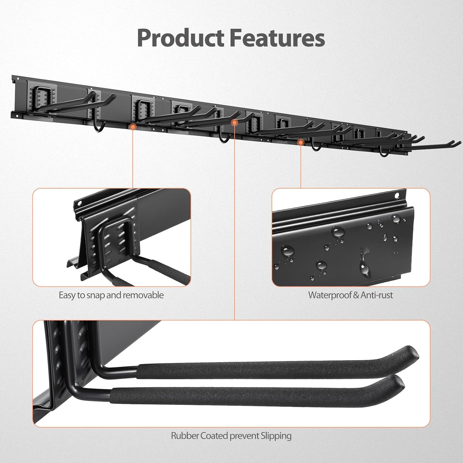 - VERSATILE WALL STORAGE SYSTEM: Our multifunctional tool storage rack accommodates a wide range of items, including garden tools, shovels, rakes, brooms, mops, extension cords, hoses, power tools, chairs, ladders, and sporting equipment. Effectively optimizing your storage space while keeping everything easily accessible and organized.