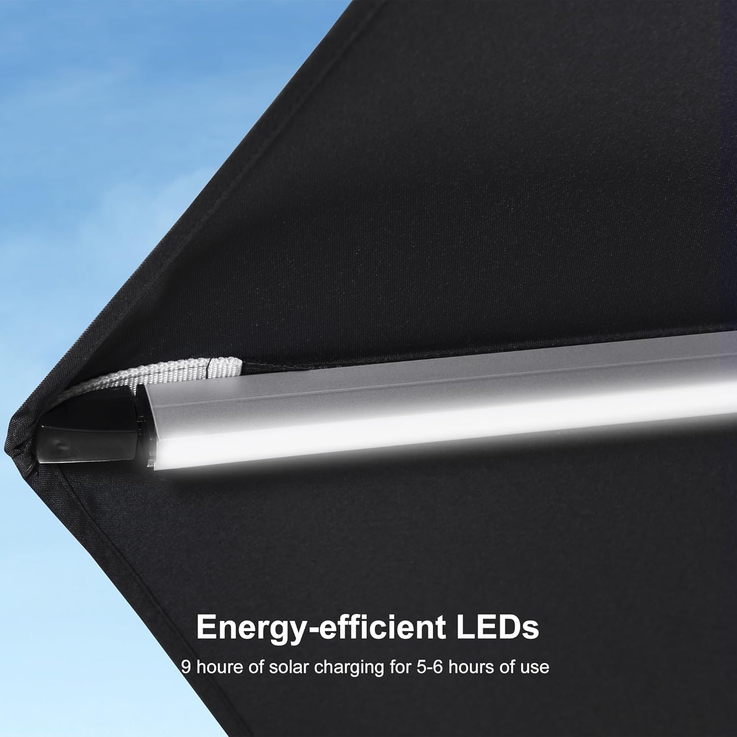 - All-aluminum umbrella bones and 8 heavy-duty ribs, anti-oxidation spray painted, with LED light tubes, extension of time of use