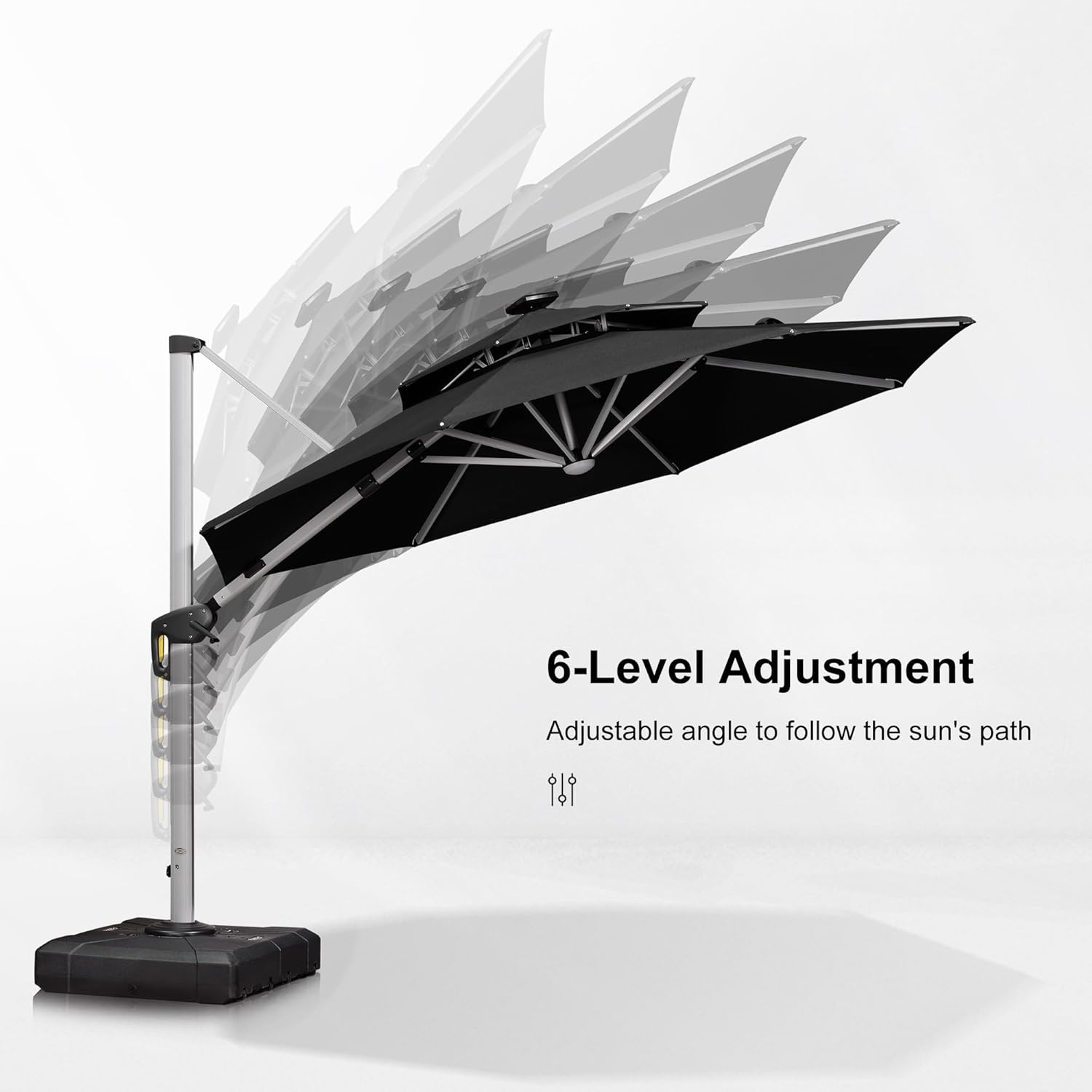 - The cantilever umbrella includes a weighted base