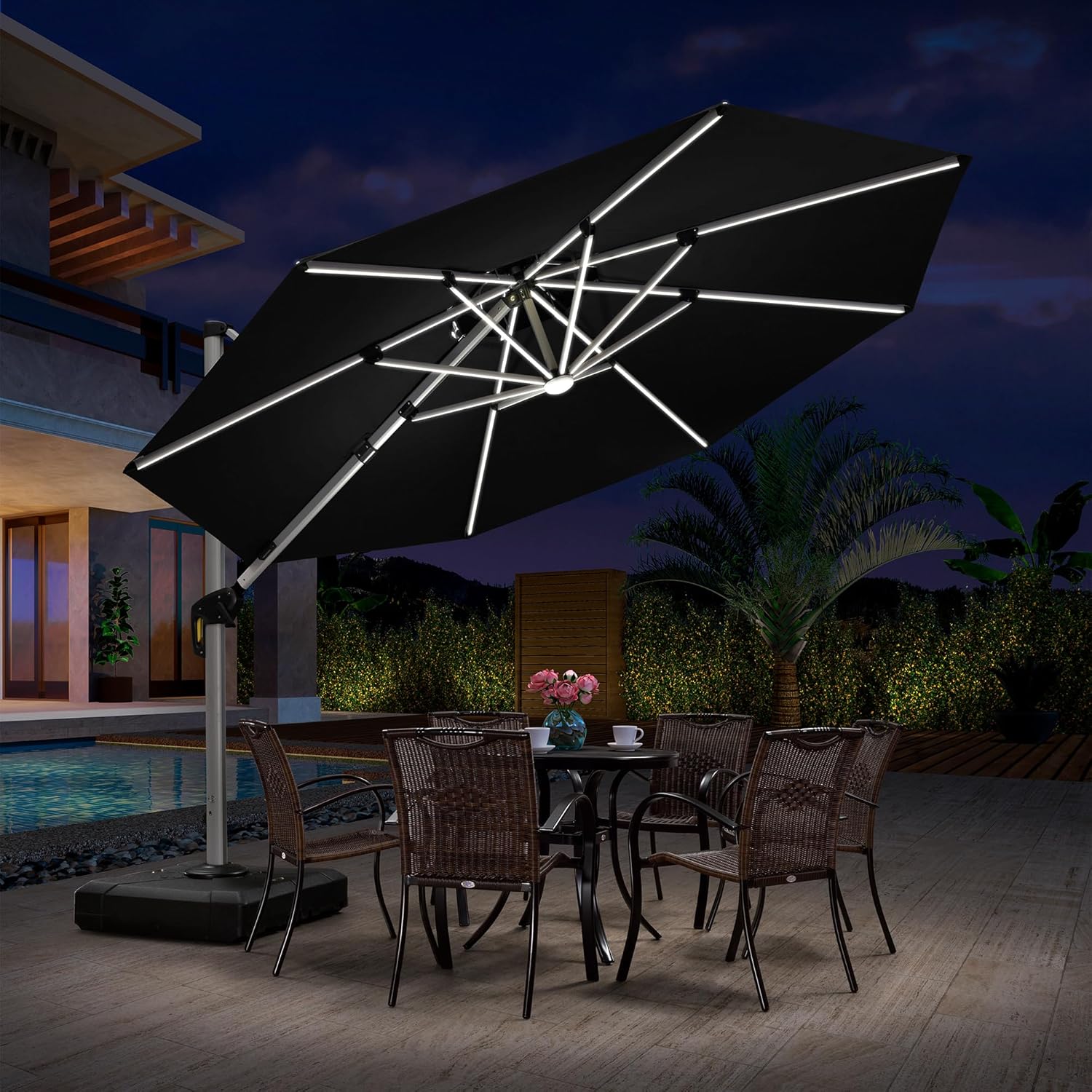 PURPLE LEAF 11ft Patio Umbrella With Base Solar powered LED Cantilever Umbrella with LED lights Windproof Outdoor Offset Umbrella for Garden Deck Pool Patio, Black