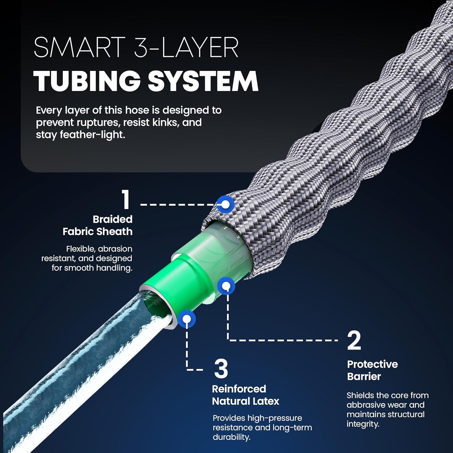 - [Universally Compatible Kink-Free Design] Engineered with standard 3/4" GHT, corrosion free, pure brass connectors, our hose fits a wide array of faucets nozzles and accessories. The ultra flexible, never kinking design contributes to a hassle-free watering experience. The triple layer construction provides a durable and manageable garden hose with dependable performance in various weather conditions.