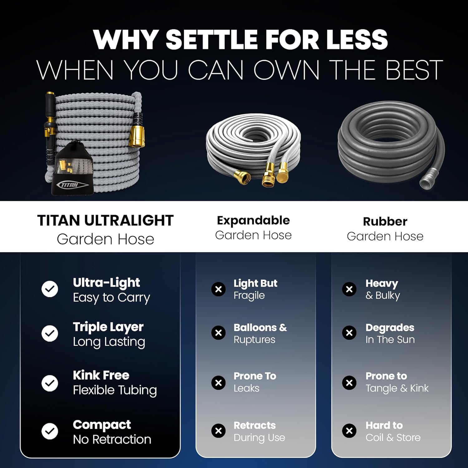 - [Feather-Light, Super Strong] Redefining watering with its incredibly lightweight design, experience unmatched watering efficiency with our Titan garden hose. When paired with our precision-engineered nozzle, this hose delivers exceptional pressure for everyday watering tasks while saving you water. Ideal for garden maintenance, vehicle cleaning, RV, marine use and more, for a powerful and consistent water flow.