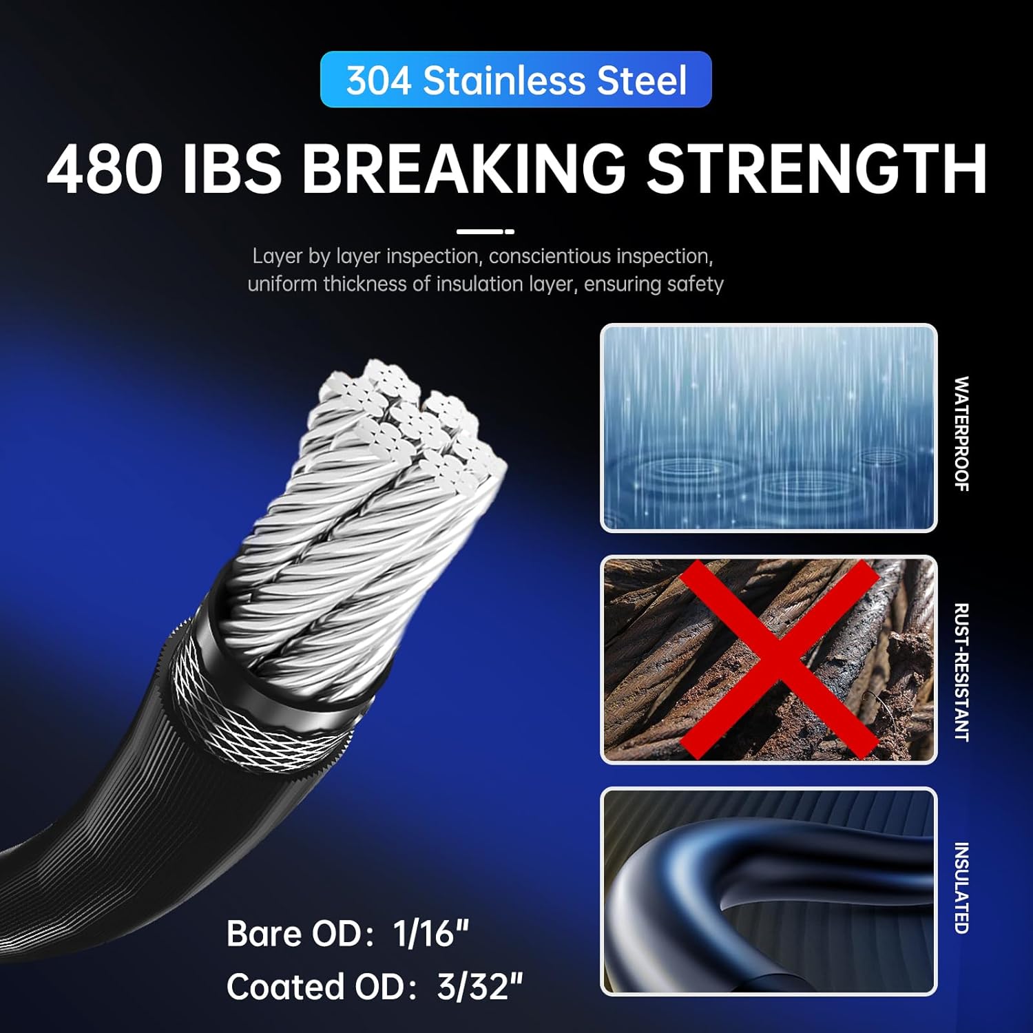 - 【304 Stainless Steel Cable 】:The Wire Cable Bare OD is 1/16", Coated OD is 3/32", Made of 304 Stainless Steel,480 lbs Breaking Strength,7×7 Strands Core , There are 7 Strands and Each Strand Contains 7 Individual Stainless Steel Wire, and Consists of One Strand of Very Strong Corrosion Resistance, Durability, and is a Moderately Flexible Cable Wire Rope, ideal for Rigging Applications that Require a Certain Degree of Flexibility ,and Suitable for All Kinds of Weather.