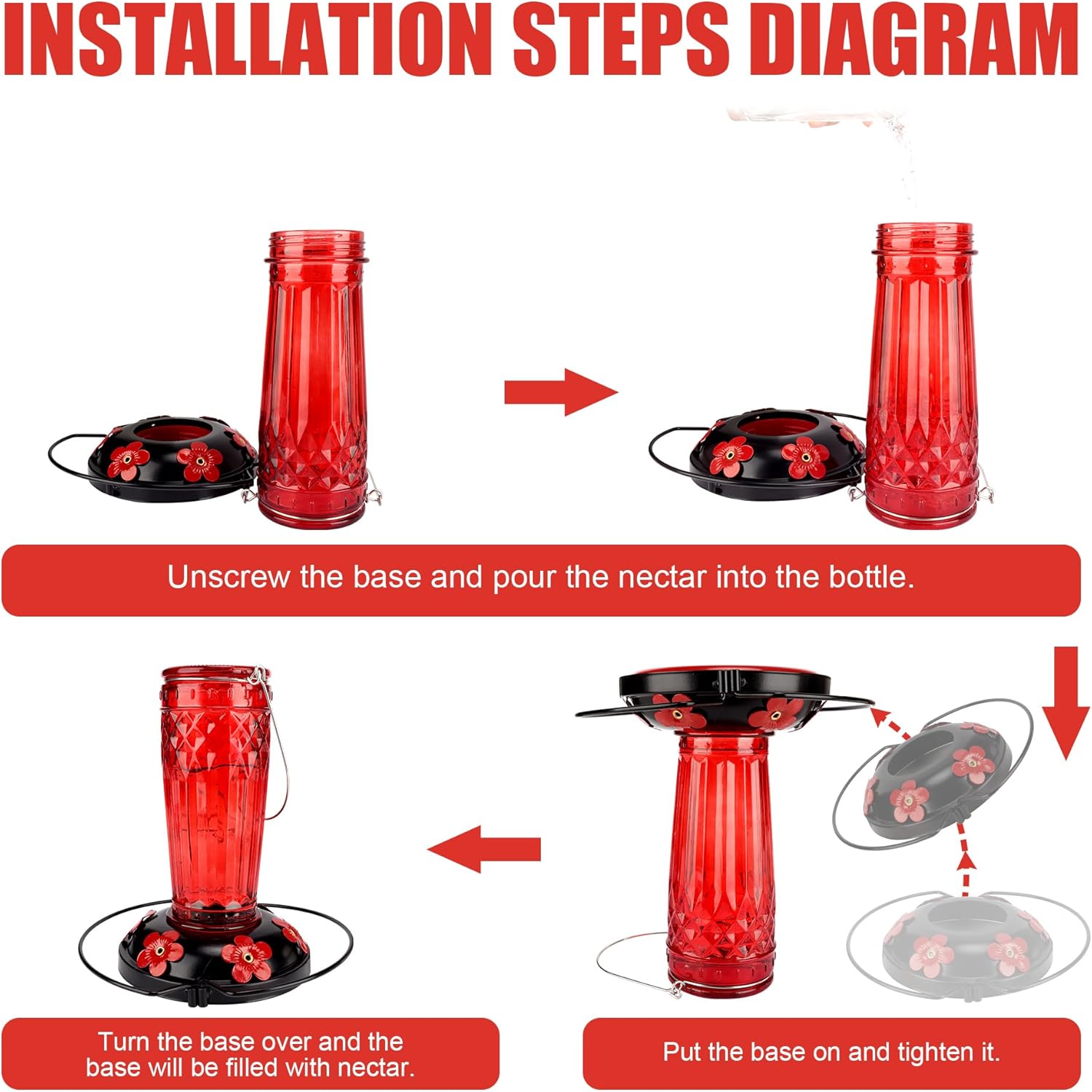 - LEAK-PROOF :Bird feeders for outdoors Built-in durable gasket,humming bird feeders unique design makes the base connection correct and seamless. After filling the container and screwing it to the base, flip it over and hang it on a tree hook/deck hook/shepherd's hook.