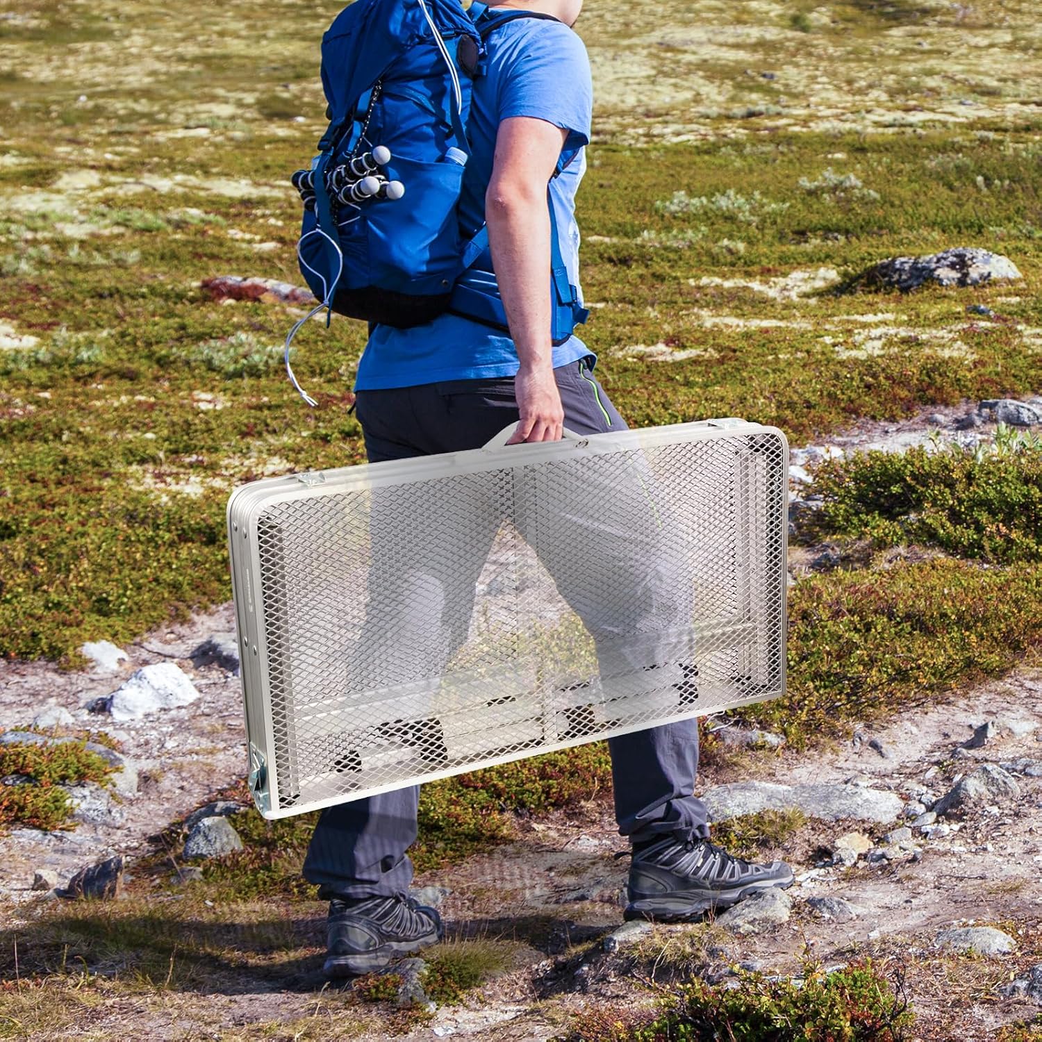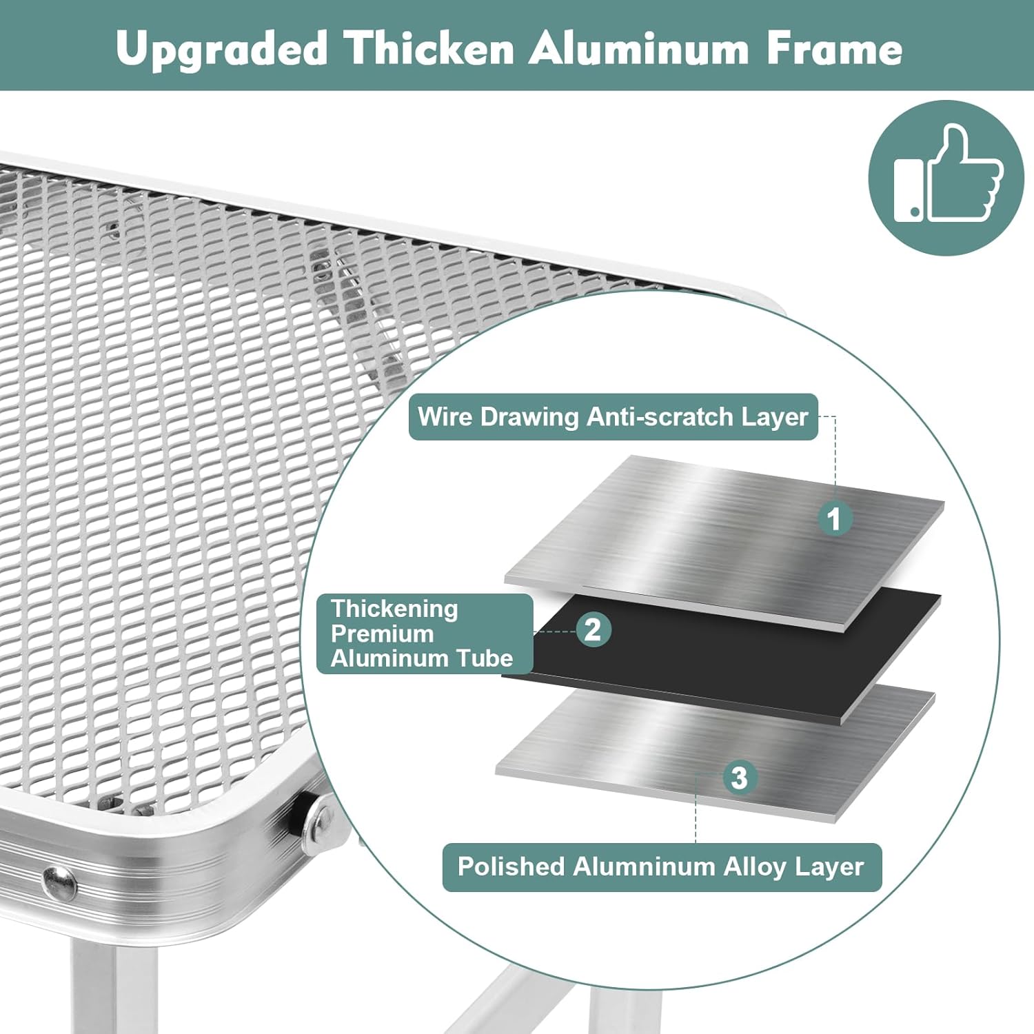- [Robust and Sturdy] The folding table is made of high-quality aluminum alloy, ensuring its sturdiness and durability. The table top is designed with a metal mesh surface and has been treated with a thickened paint coating, allowing it to withstand prolonged exposure to high temperatures. When stored in the garden, it is resistant to rain and snow, as the limited contact area with the table surface minimizes the risk of staining and rusting