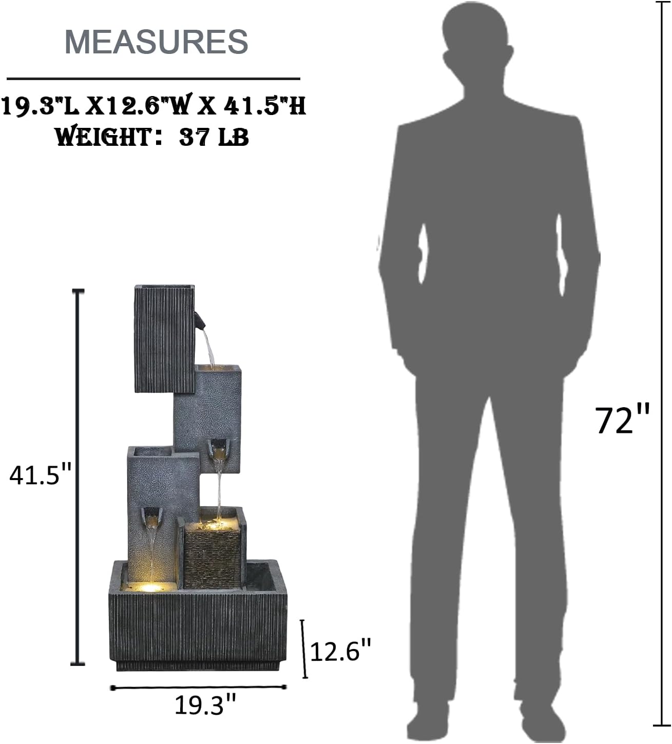 - SIZE AND ACCESSORIES - The size of the patio fountain is 19.3"L x 16.2"W x 41.5"H.To Fit Any Outdoor Area.9.8 ft Power Cord(Extended power cord solves your space problems).Accessories Include: Garden Fountain*1,Artificial plants,Transformer*1,Pump*1,Pebbles*1,Detailed Instructions*1.