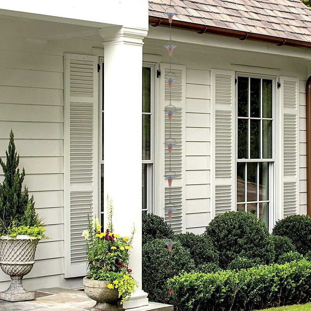 - Replacement Downspout for Gutters: The rain chain adopts a retro blue funnel shape design. Rain gutter chains can not only effectively guide the flow of rainwater, but also decorate the eaves and bringing different visual effects. An elegant alternative to traditional gutter downspouts