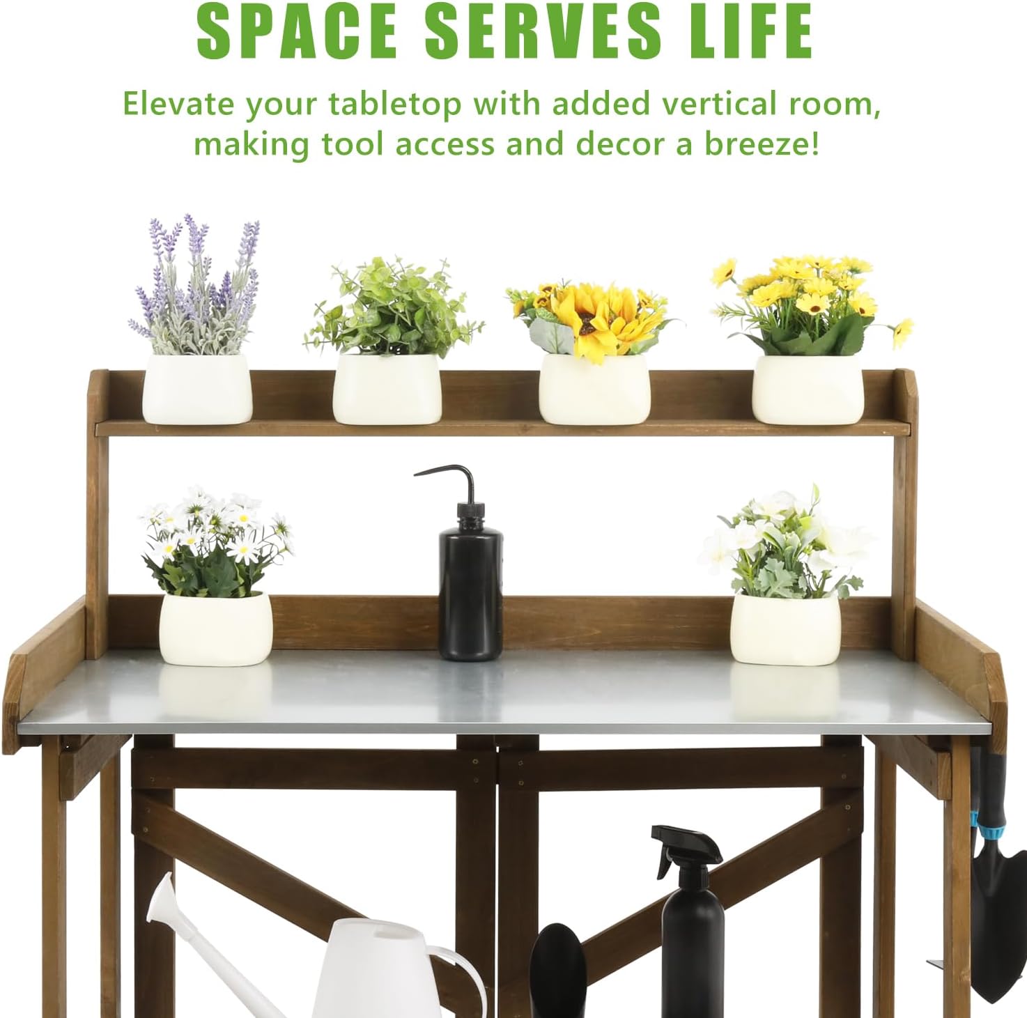- 2-TIER SHELVING: Features convenient upper shelving to house your potted plants and unused tools without taking up valuable workspace.