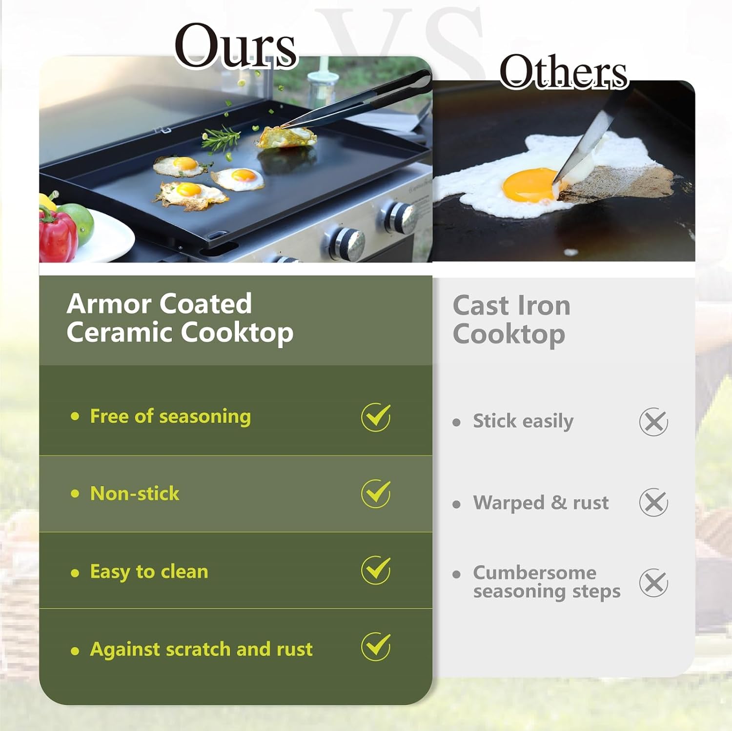 - 【Non-stick Armored Ceramic Griddle】Sophia & William flat top grill with 450 sq inches of flat top surface and features an all-new proprietary non-stick armored ceramic cooking surface, promoting a healthier cooking experience with minimal oil required. As an added bonus, the ceramic coating also protects the griddle from scratches and rust, keeping your unit looking better for longer