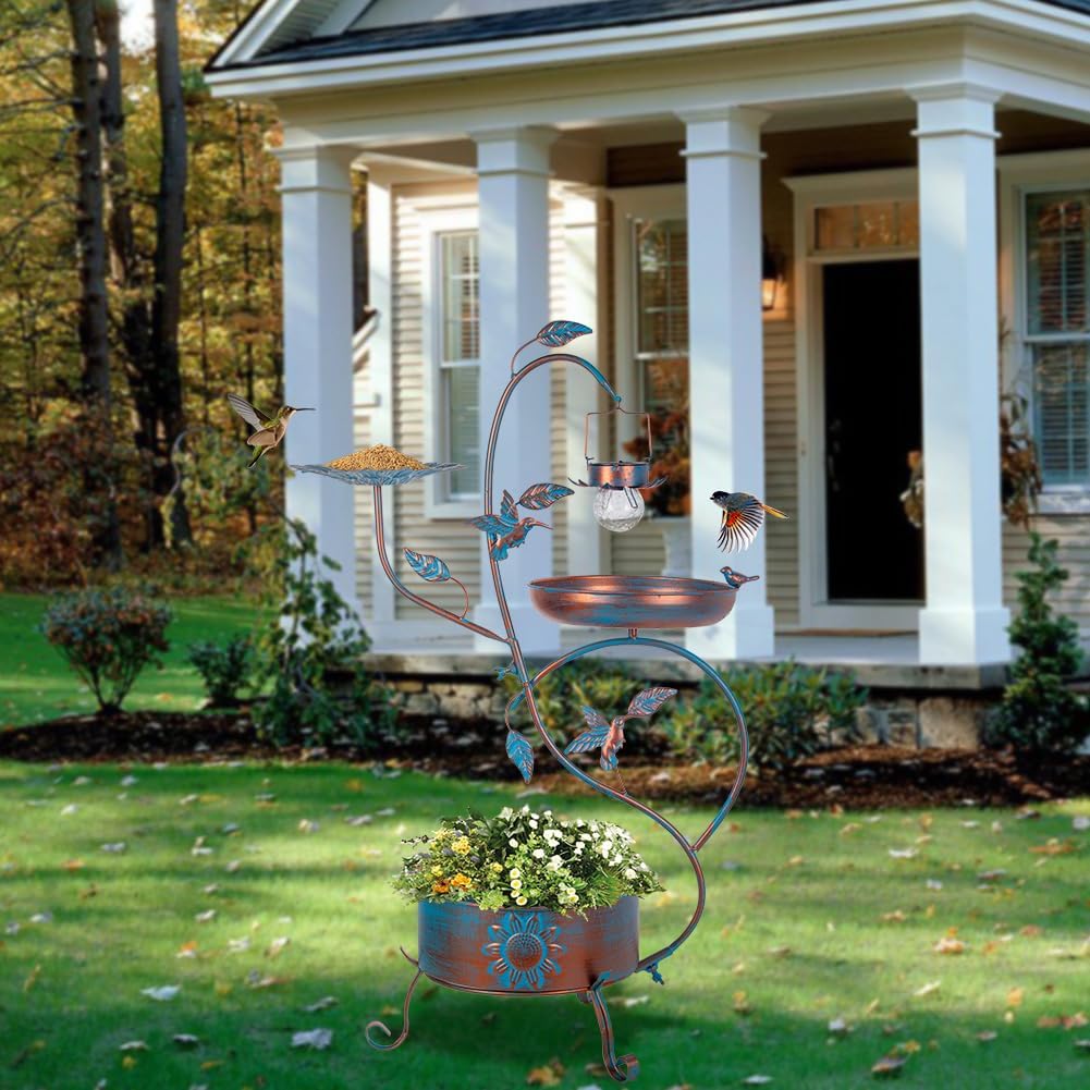 dreamysoul Metal Bird Bath for Outside, Birdbaths Outdoors with Planter and Feeder, Garden Blue Bird Baths with Solar Lights