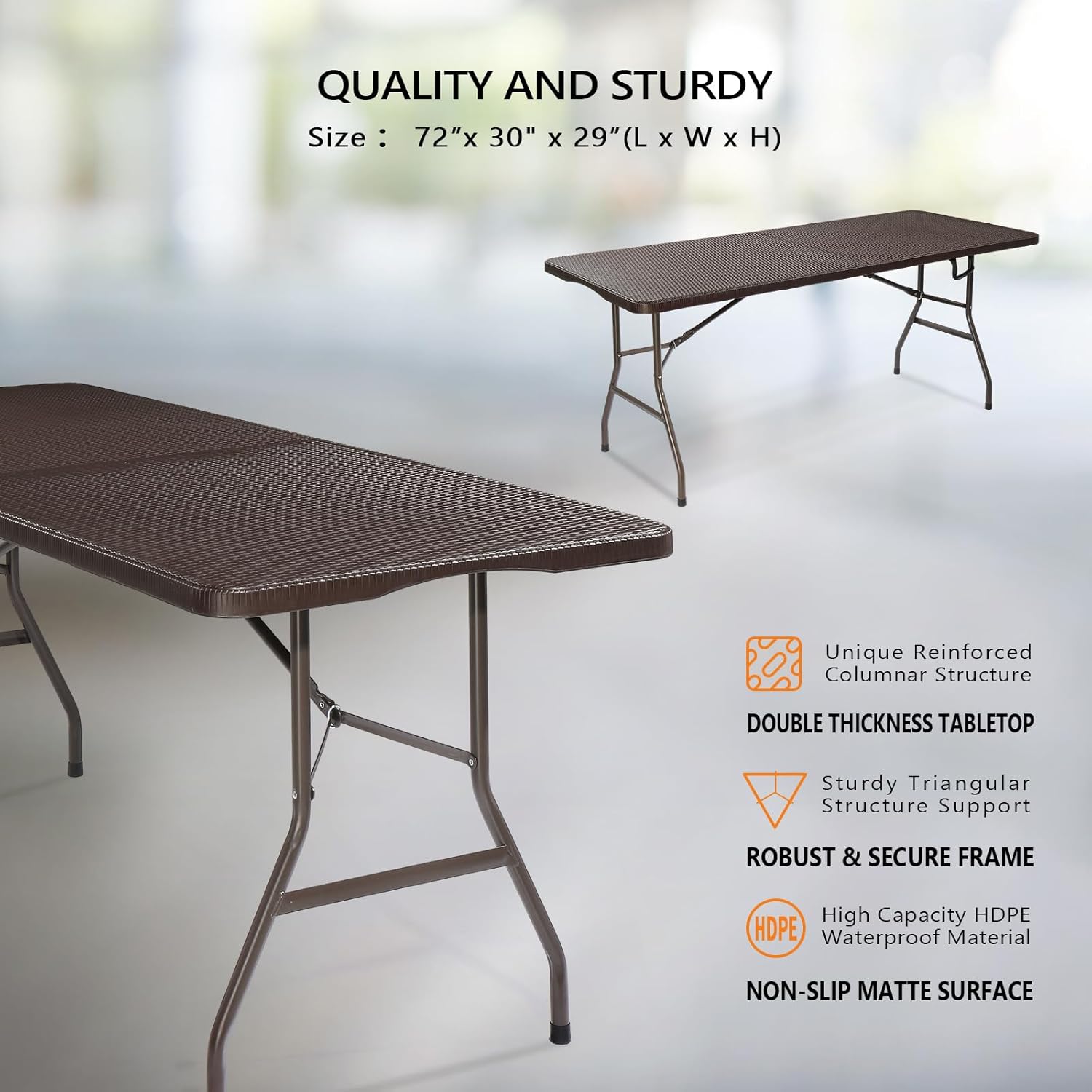 VINGLI 6 Foot Plastic Folding Table Portable Long Table for Indoor Outdoor Use Rectangular with Carrying Handle,Rattan Patterned HDPE Tabletop, Brown