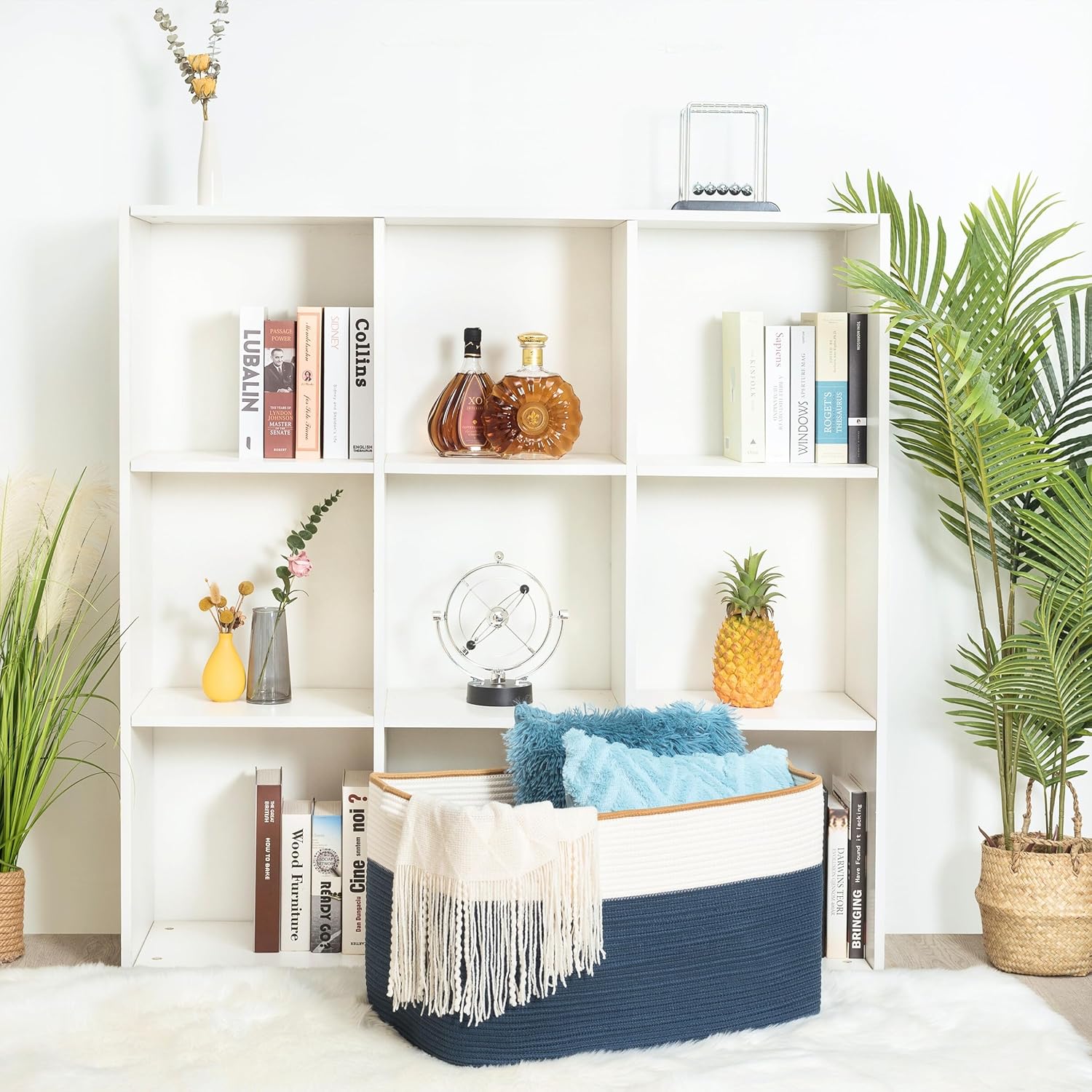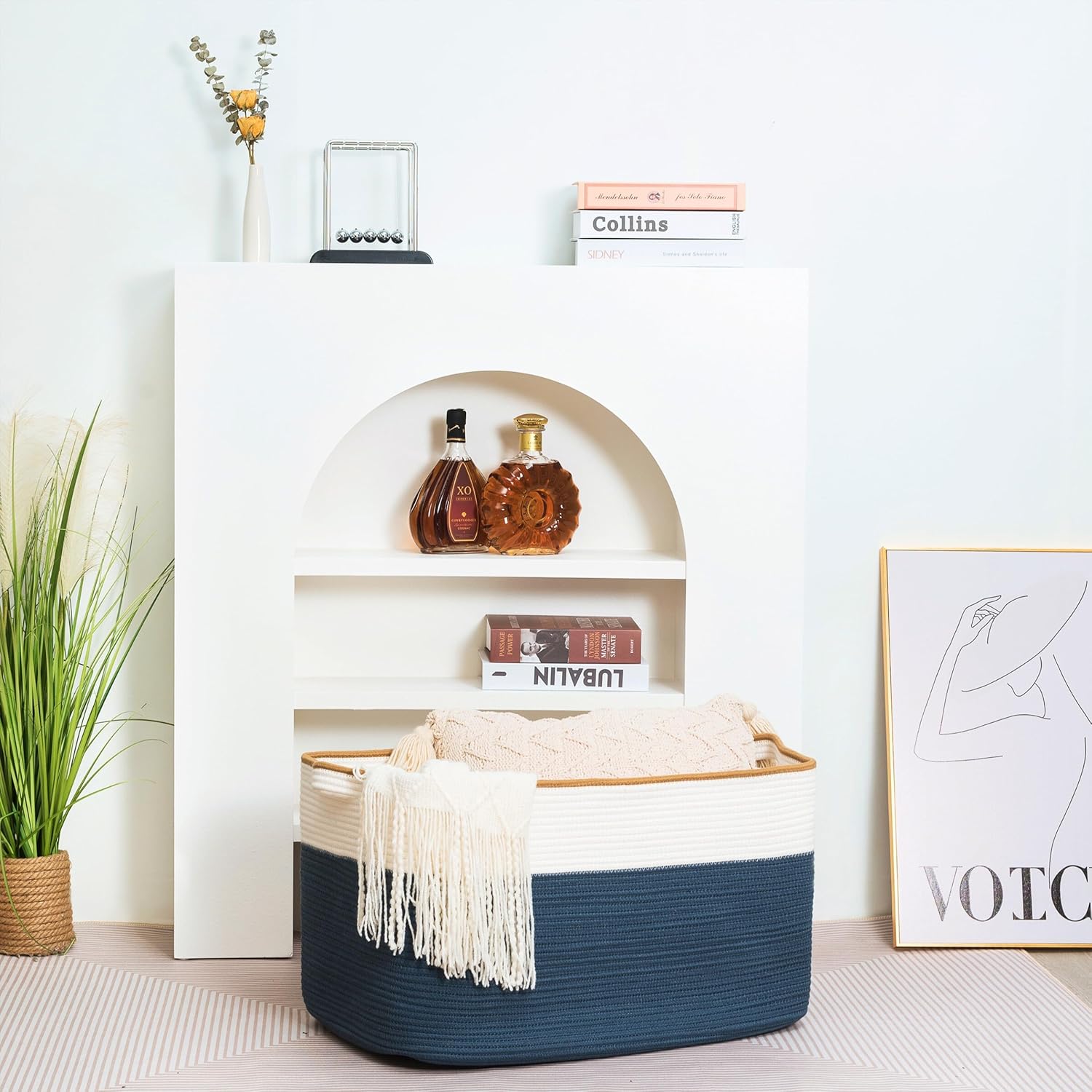 MINTWOOD Design 22in Extra Large Blanket Basket Holder Living Room, Rectangle Rope Woven Storage Basket with Handles for Laundry, Pool Towels, and Shoes, Dog Toy Organizer Bin Box, Prussian Blue