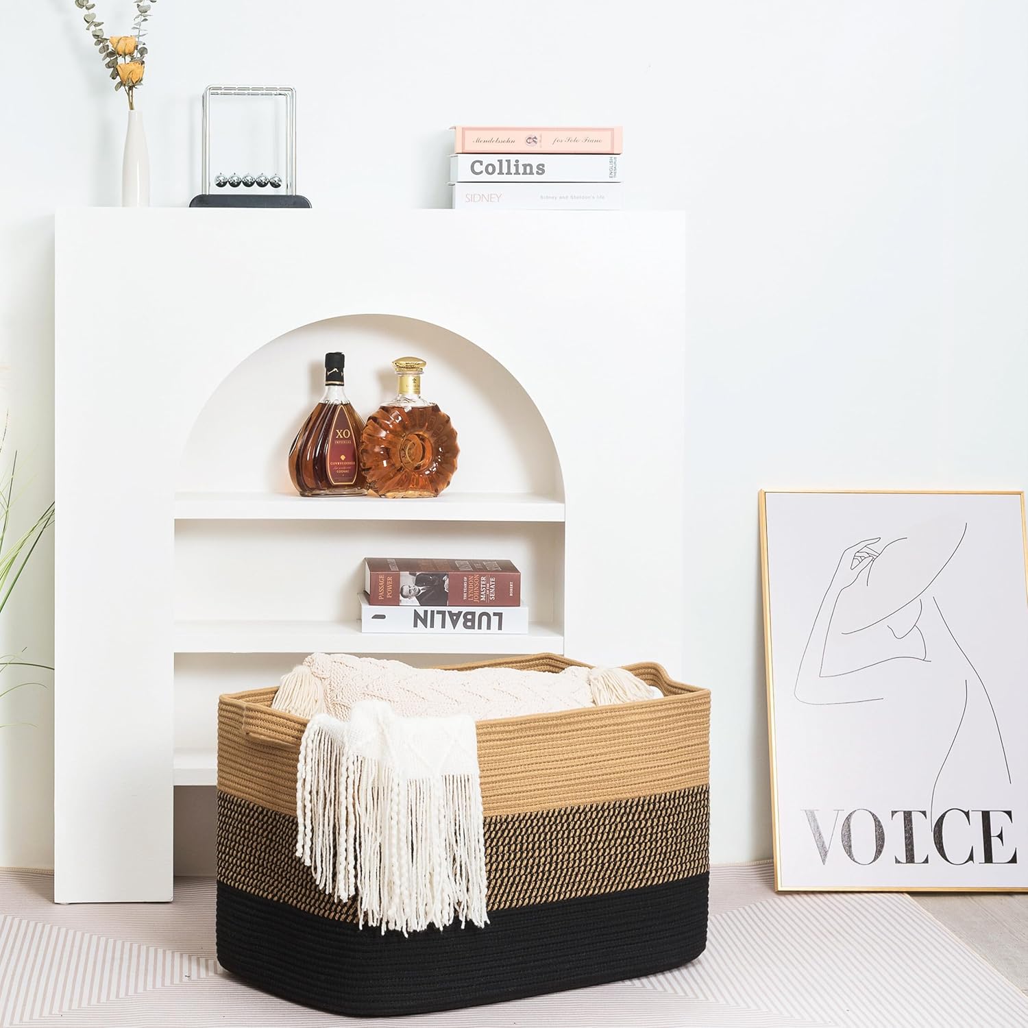 - Decorative Storage Baskets for Home Decor - A stylish, practical alternative to other boring storage solutions. Not only will our large storage baskets help you get organized, their sleek, sophisticated shape and neutral colors will complement any decor and any room: the bathroom, playroom, bedroom, living room, laundry room, mudroom, home office, entryway & more.