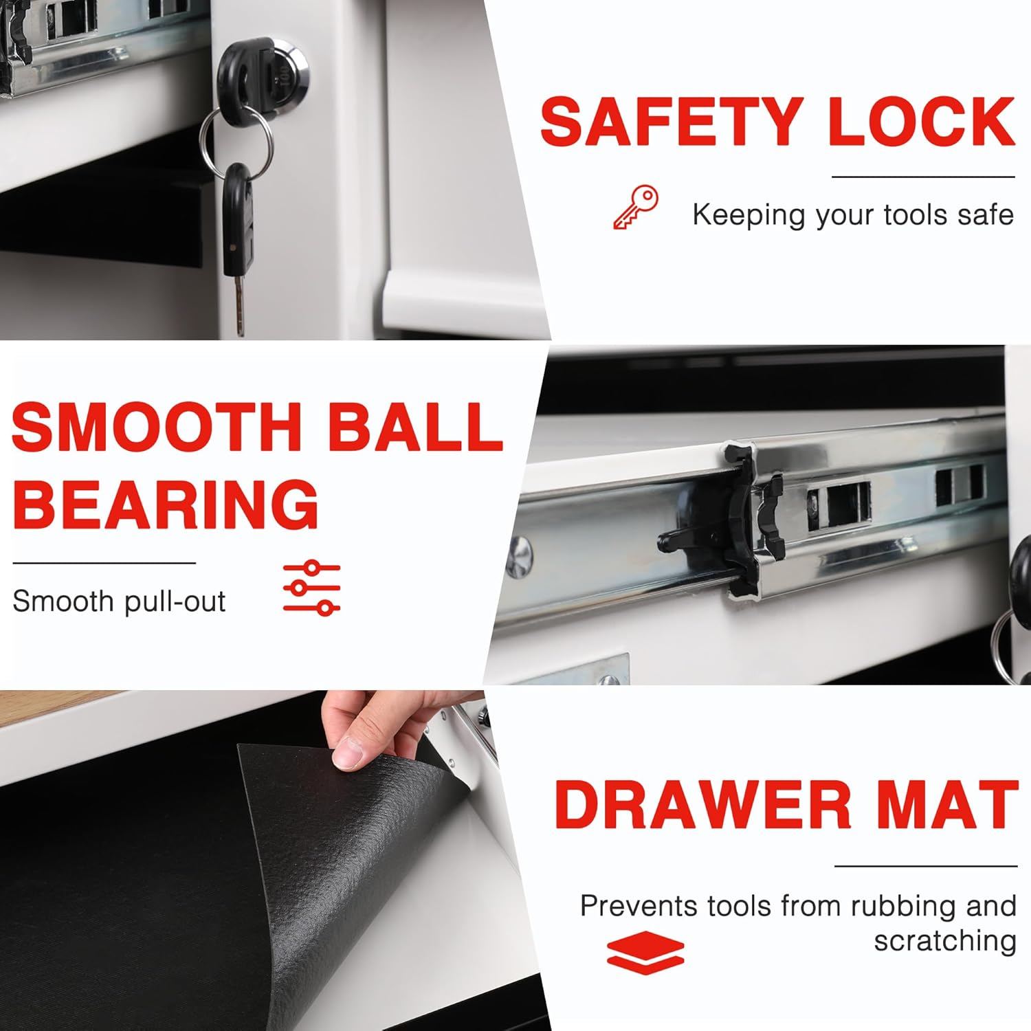 - Secure Design: The rolling storage cabinet features a reliable locking system with matching keys to prevent drawers and doors from sliding open during movement, thereby safeguarding your tools. Protective bumpers on all four corners reduce potential damage from collisions, prolonging its lifespan.