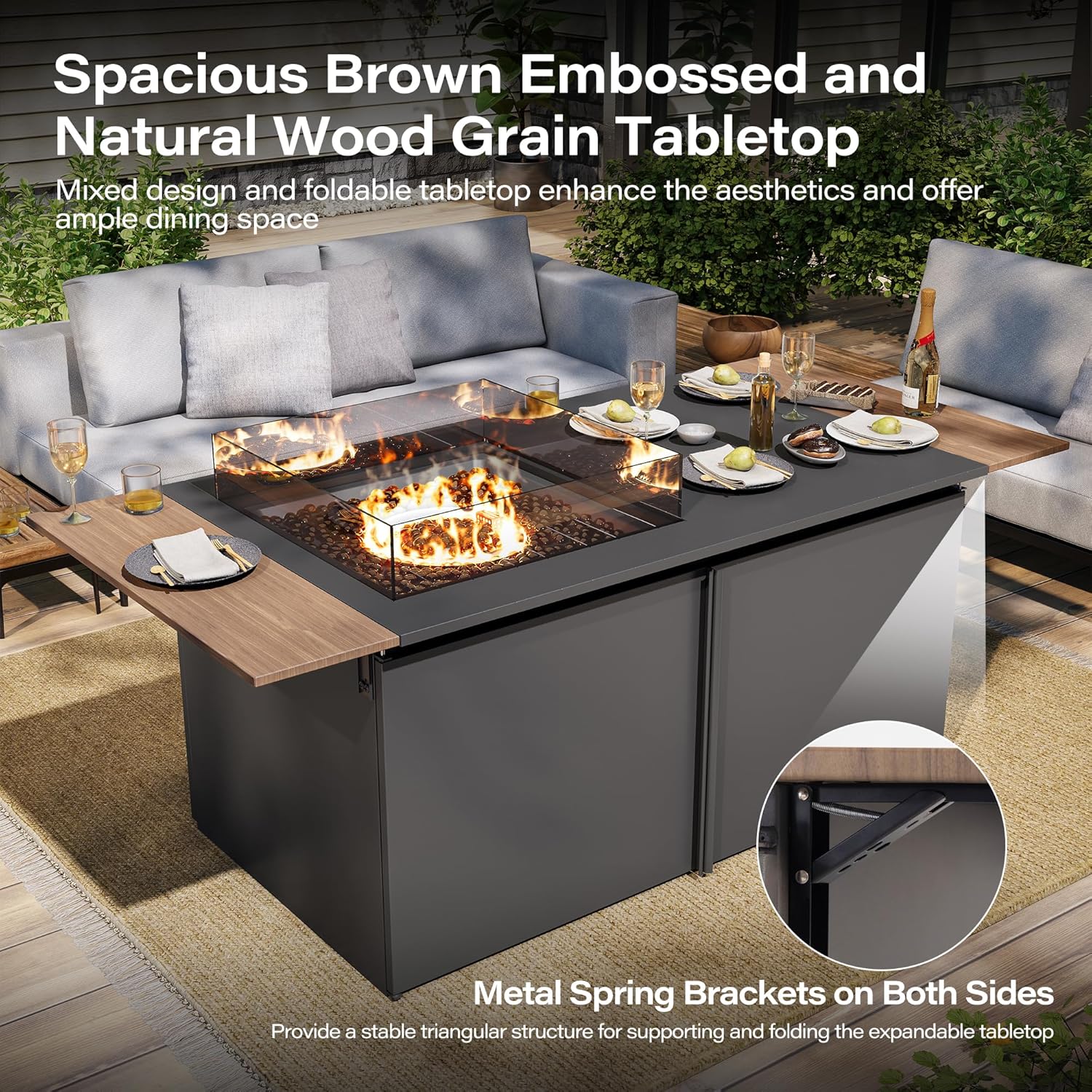 - Versatile Firepit Table - With dimensions of 64''L x 29''W, this outdoor fire pit table can be easily converted into a spacious dining table by covering the metal lid. With a tabletop that expands to 64'' and folds to 50'', this firepit offers an ideal spot to keep your snacks and drinks within arm's reach.