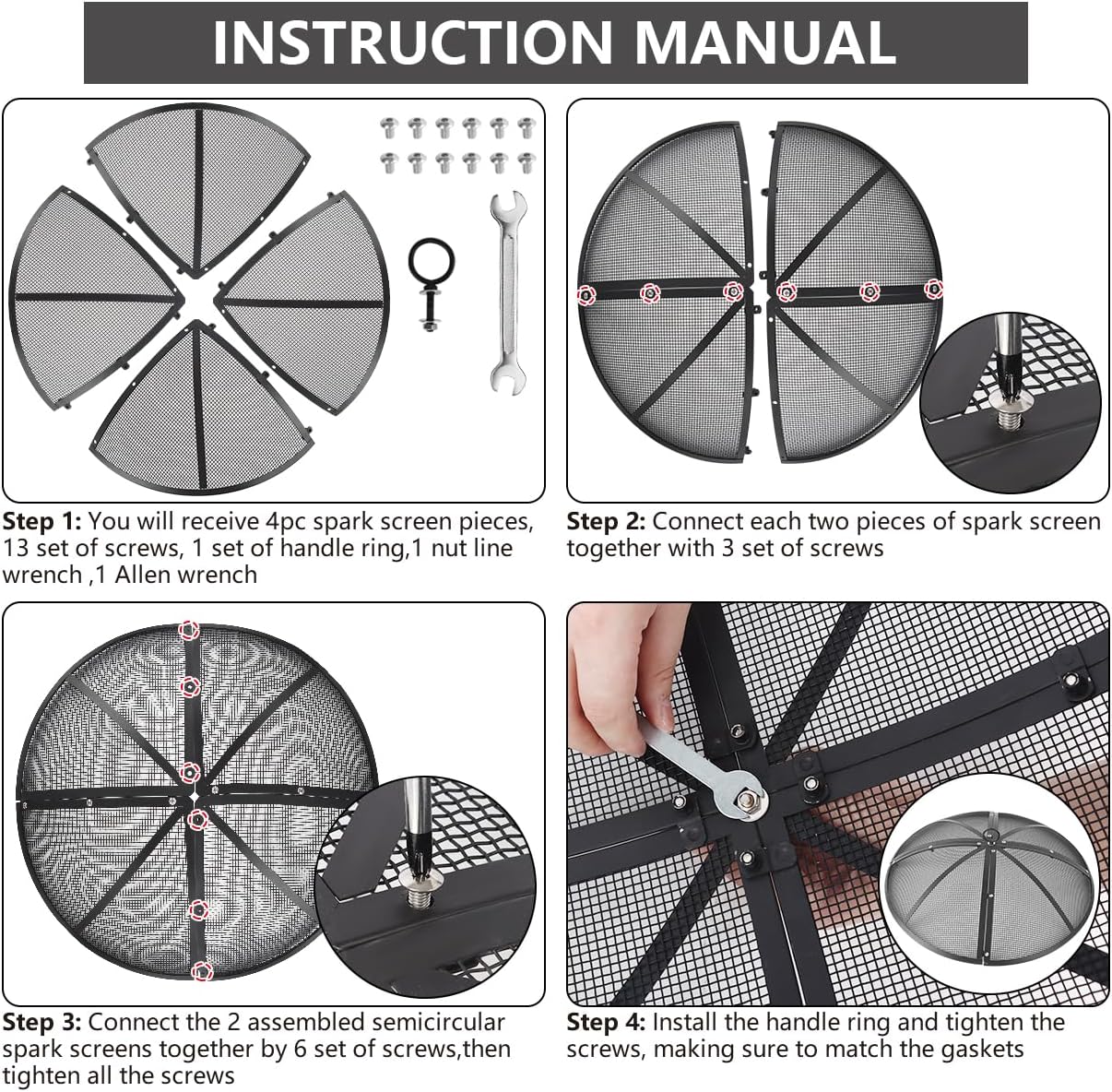 - 【Simple installation】: Our fire pit lid does not require complicated steps. Through the screw connection, the operation is very simple. It can be divided into 4 pieces, which can easily store it and occupy a small space. You can easily carry it, which is very suitable for travel adventure. It can effectively reduce the splash of sparks, embers and debris