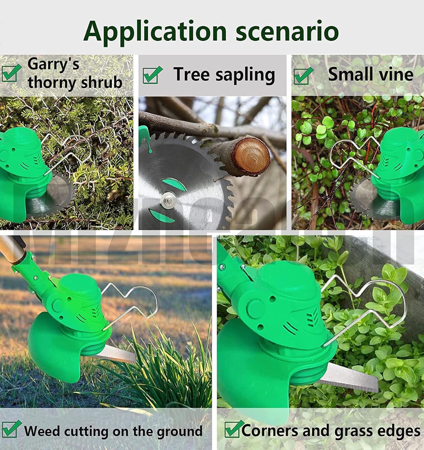 - APPLICABLE to a VARIETY of SCENARIOS:Battery powered weed wacker eater with 3 kinds of blades, plastic cutting disc, metal cutting disc, alloy round saw cutting disc. Cordless lawn mower you can trim the lawn and cut young grass, you can also cut thicker grass, and you can also cut branches and hard bushes