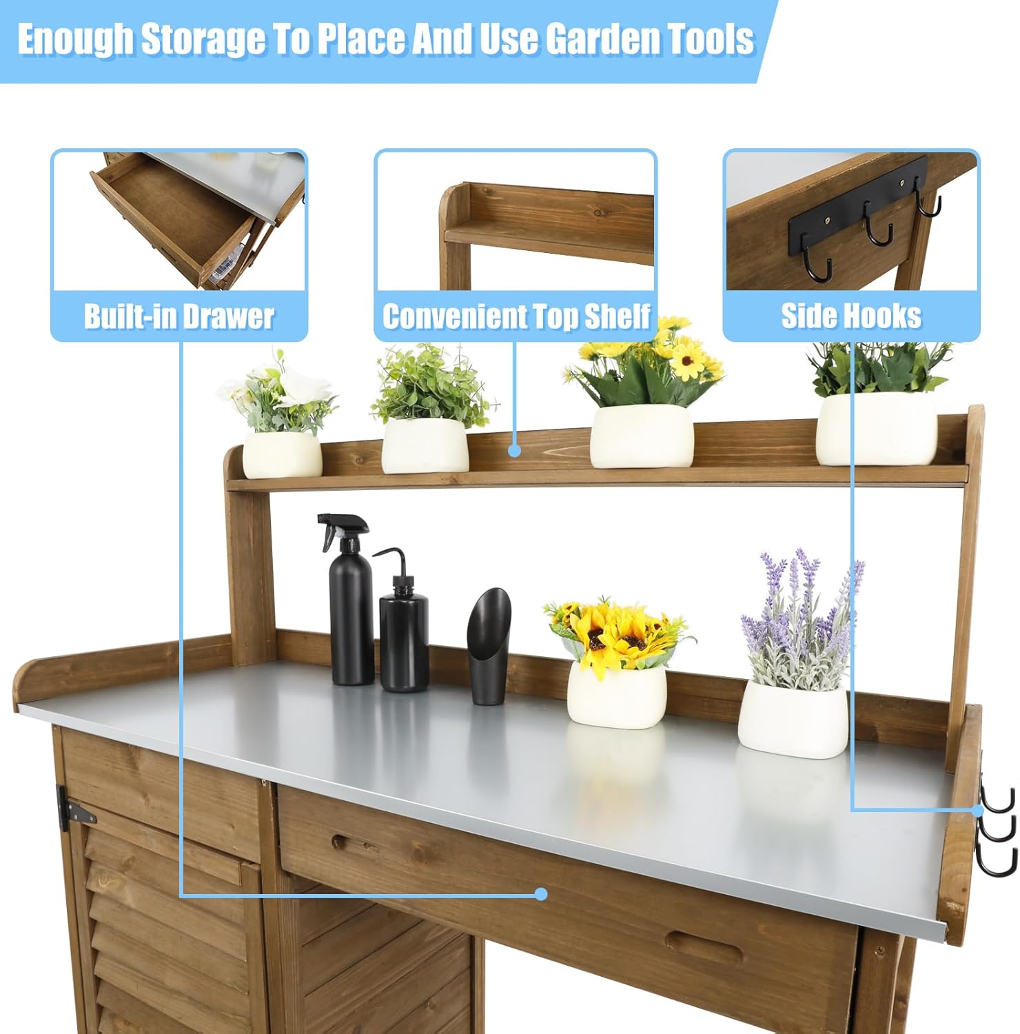- 【Thoughtful Details】The top shelf of the work table can house your planted flowers and tools. The raised tabletop edges can prevent the falling of items on the top. The drawer, lower slatted shelf, storage cabinet and top shelf of the planting table make you store a variety of tools more easily. 3 side hooks are perfect for keeping your favorite trowel, trencher or other tools in arm's reach.