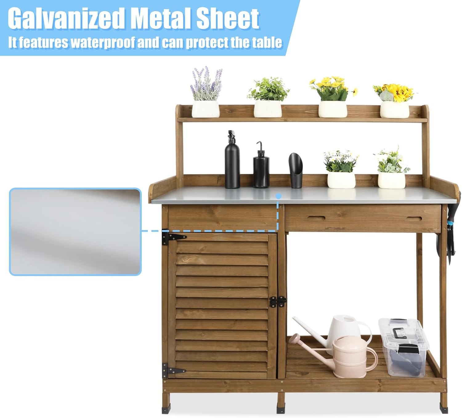 - 【Galvanized Metal Tabletop】Compared with wooden tabletop, the galvanized table of the flower plant pot bench features better waterproof and durability. Just washing it with water or wiping it clean after use, which can provide enough convenience for your gardening work.