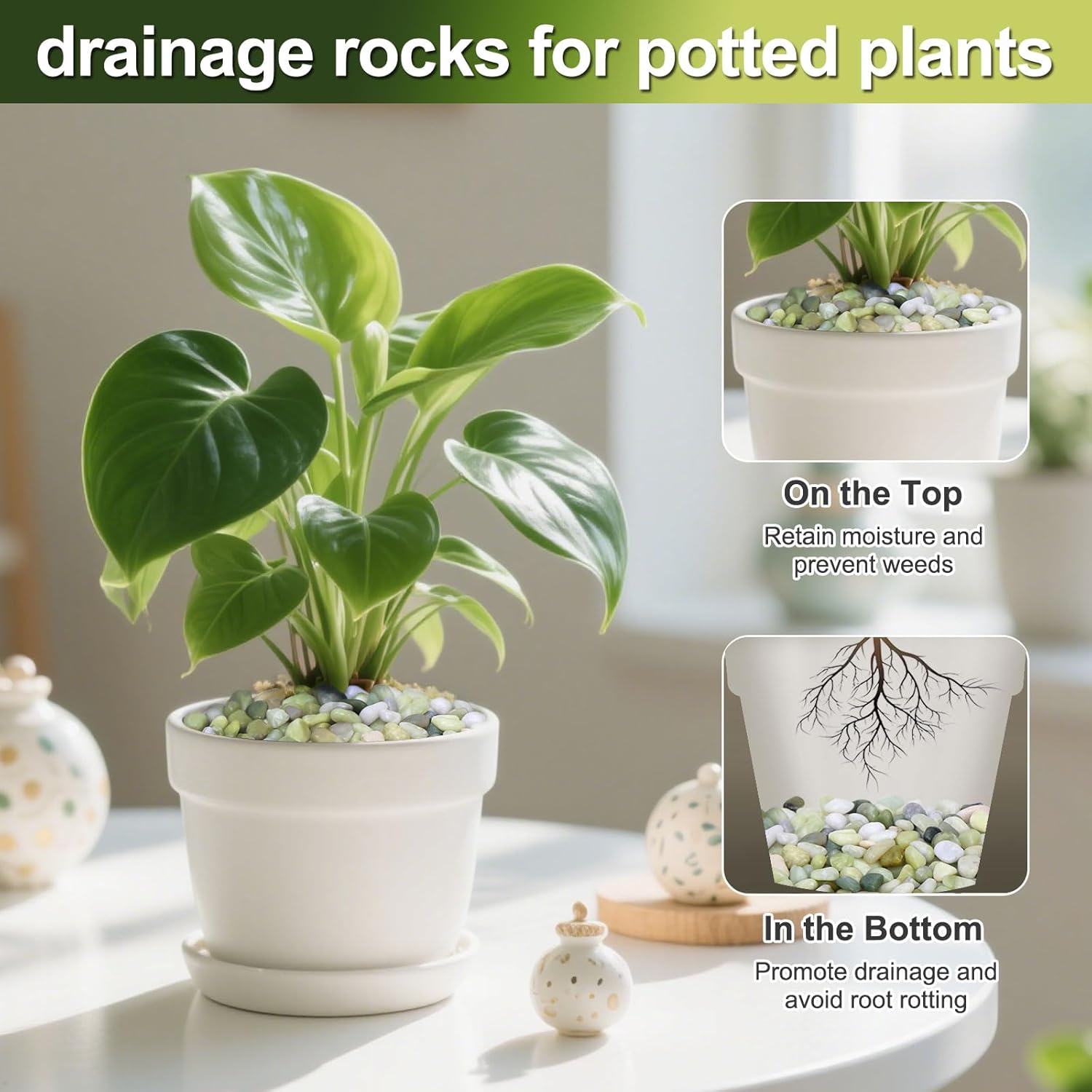 - 【Benefits for Plants】 Covering pots with river rocks enhances plant aesthetics, regulates soil moisture, and prevents weeds. Placing river pebbles at the bottom of pots promotes drainage and prevents root rot.