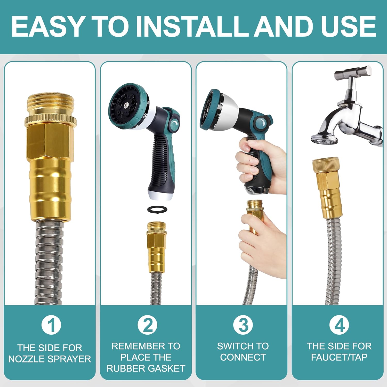 - Durable & Built to Last: Made with high-grade 304 stainless steel and reinforced PVC inner tubing, our garden hose is designed to resist rust, punctures, and leaks, ensuring longevity and reliability in varying weather conditions.