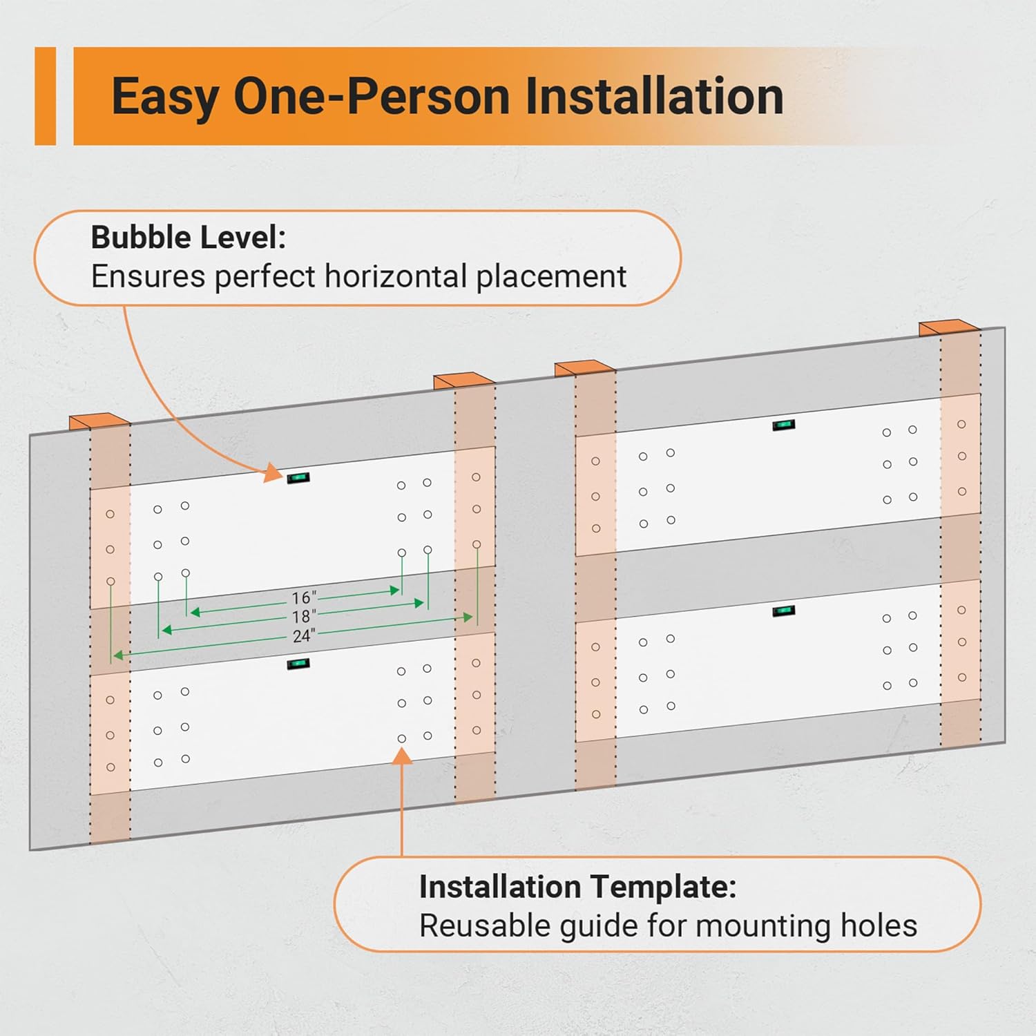 - Adjustable Spacing Design: Compatible with different stud spacing and wall types such as wood studs/joists and concrete walls (cannot be installed on metal walls) and can be used with wood stud spacing of 16", 28" or 24".