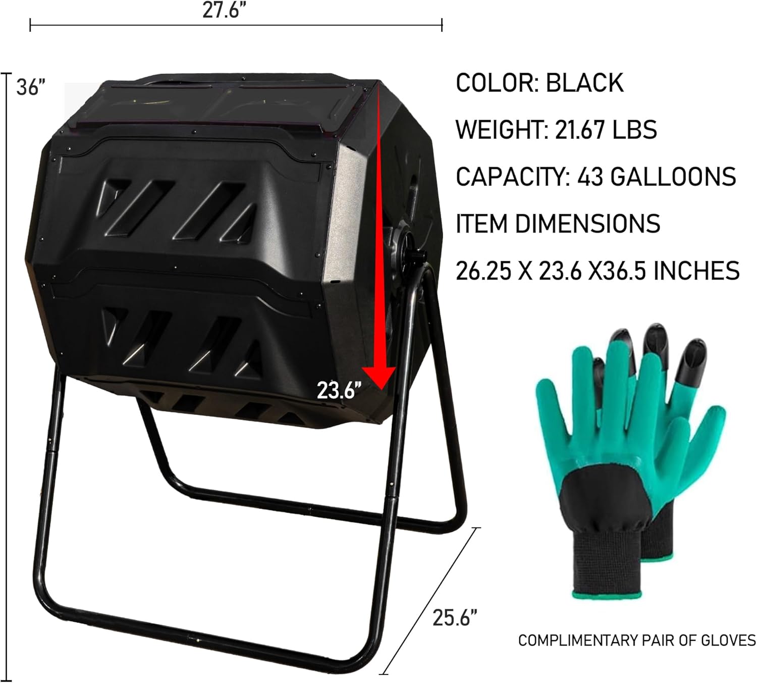 - 43 Gal Dual Chamber Composter: This 43 gallons composter with dimensions of 27.6 × 25.8 × 36 inch. This large tumbling composter makes recycling kitchen scraps a breeze.