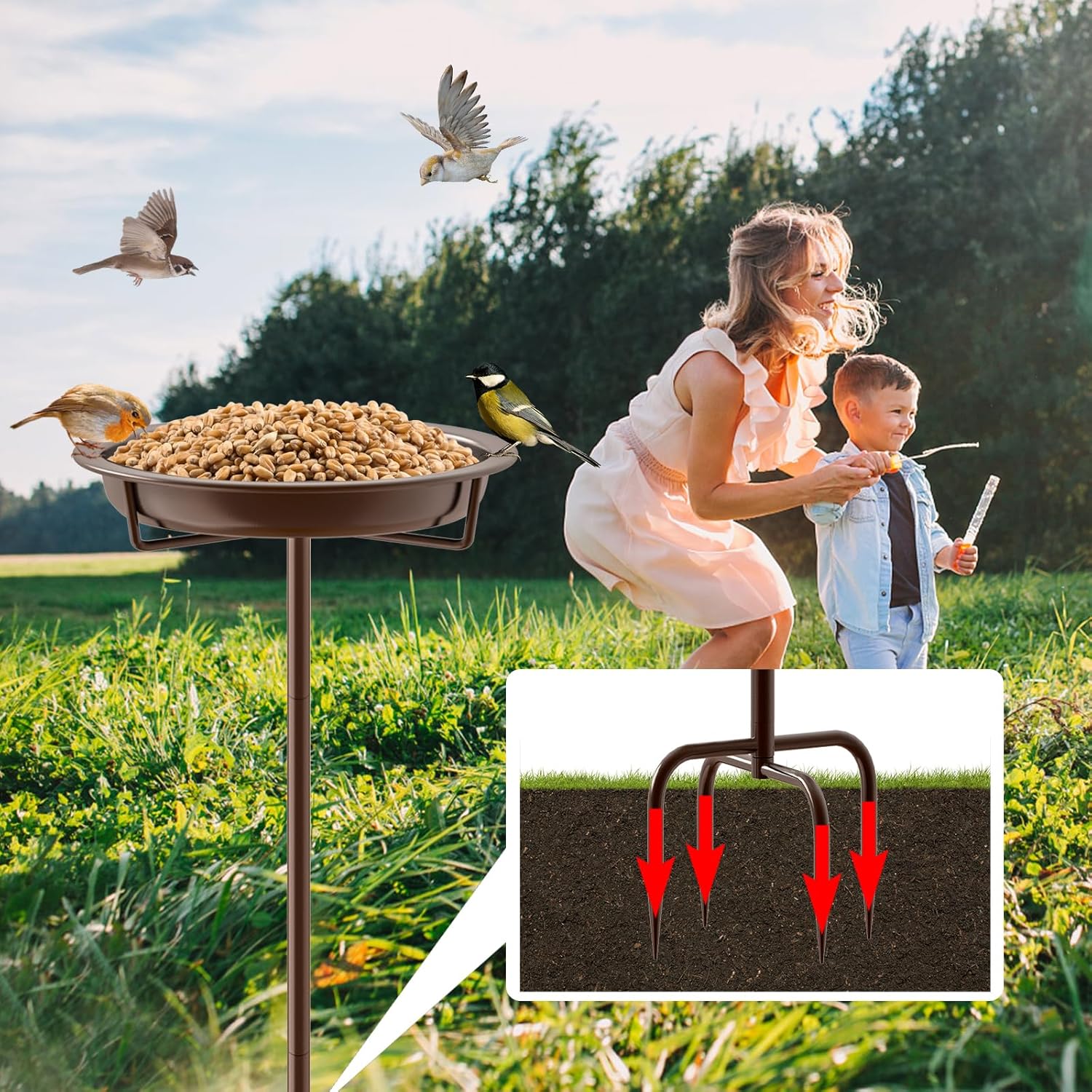 - 【Sturdy 4-pronged Base】 Bird bath with 4 solid prongs base adds more stability for this birdbath so that it is hard to bend, break or fracture, greatly enhance the stability of the product.You can inserted birdbath into the ground or lawn of patios and gardens.