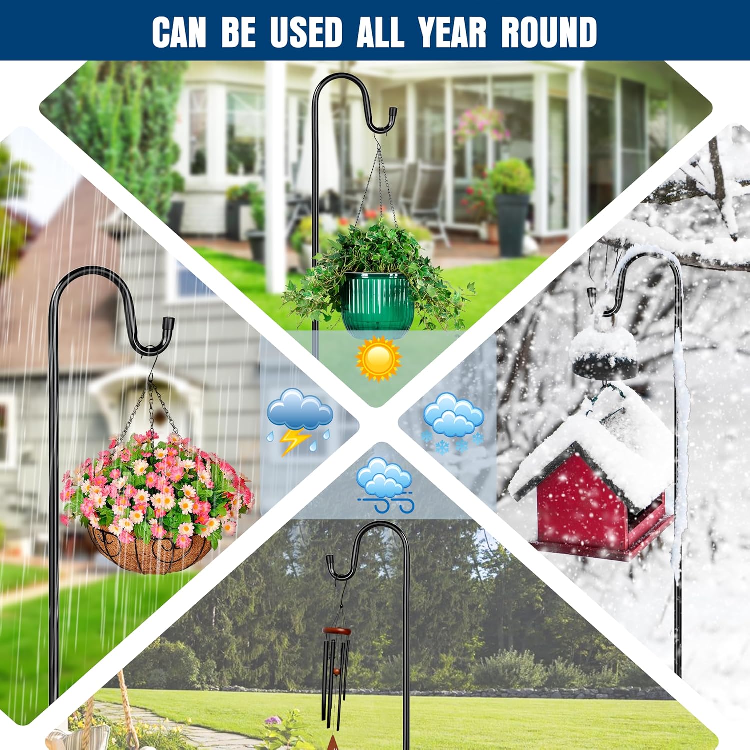 - 【Upgraded in Stability & 5 Base Prongs】Compared to other similar hooks in the market, our heavy-duty shepherds hooks have upgraded with 4 extra long and double-forked base prongs to be total 5 prongs which makes it the strongest garden hook in the market and maintain a fixed, upright posture while remaining firmly planted in the ground without easily falling down.