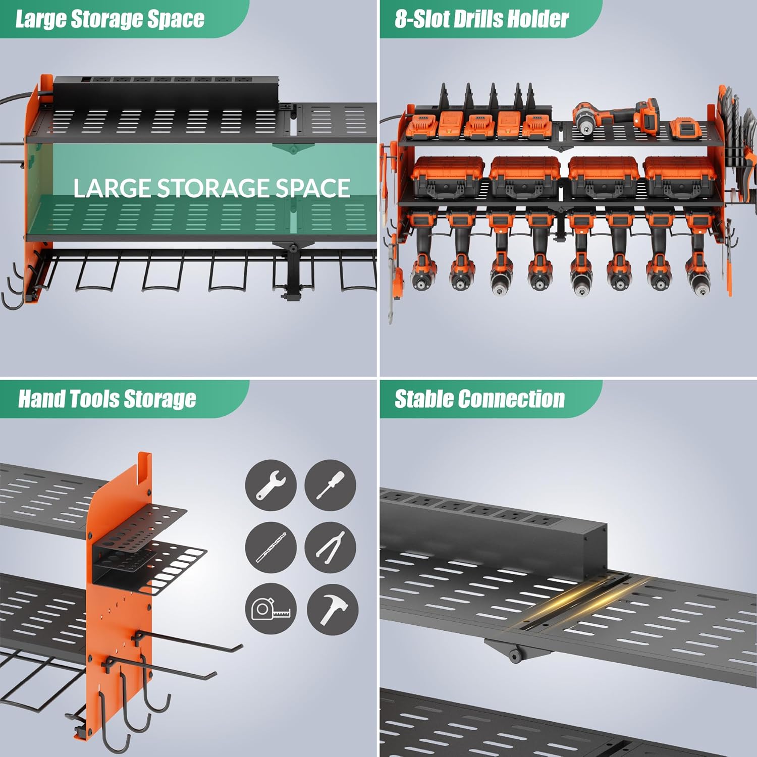 - Store Over 50 Tools: Our power tool rack efficiently organizes your charging stations, batteries, toolboxes, drill bits, hammers, and other garage tools. You can make the most of wasted wall space and save time searching for tools. This power tool storage rack is perfect for garages, homes, workshops, sheds, backyard shops, and more. The heavy-duty floating tool rack makes a perfect gift for fathers or husbands, helping them better manage and utilize their various tools.