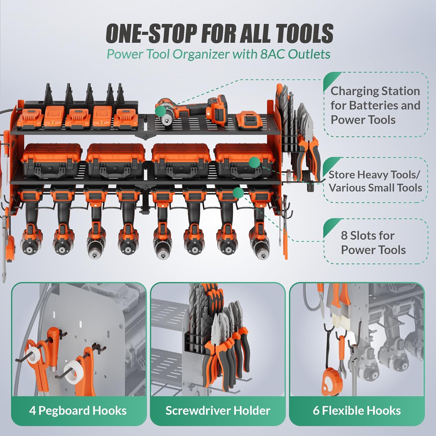 - Multi-Functional Space-Saving Design: Suchtale power tool organizer is not just for storing power tools. It features adjustable hooks and brackets on the side, allowing you to customize the layout to accommodate different types and sizes of tools, such as screwdrivers, nails, bolts, and screws. The bottom tier can hold up to 8 cordless drills, while the top two tiers are ideal for other heavy tools and various small tools.