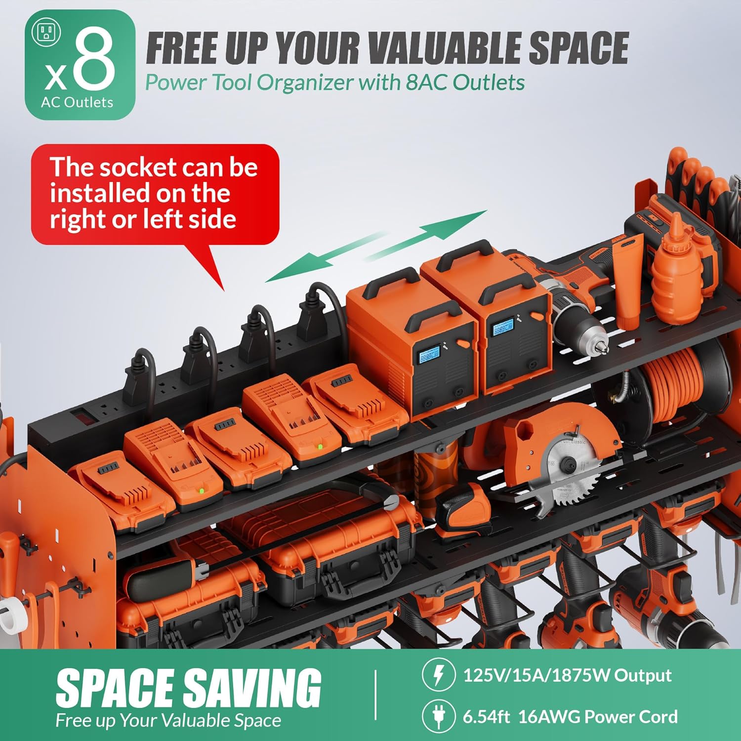 - Built-in 8 Power Outlets: Suchtale storage rack comes equipped with eight power outlets, providing convenient power connections for your power tools, eliminating the need for additional power strips and making your work more efficient. The outlets can be installed on either the left or right side, depending on the location of your wall outlet, offering an optimal storage solution. The outlets feature a 6.5-foot long 16AWG power cord, with an output of 125V/15A/1875W, suitable for most power tools.