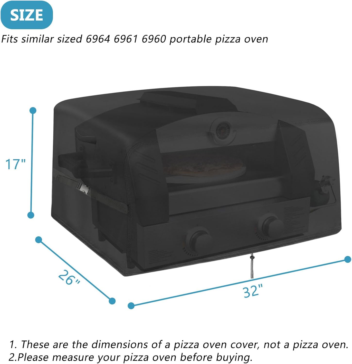 - PIZZA OVEN COVER SIZE: 32 "L x 26" W x 17 "H. The grill cover fits 32inch blackstone pizza oven, similar sized 6964 6961 6960 portable blackstone griddle, protects your outdoor pizza oven from water and dirt. Also fits for other portable grill with similar sizes.