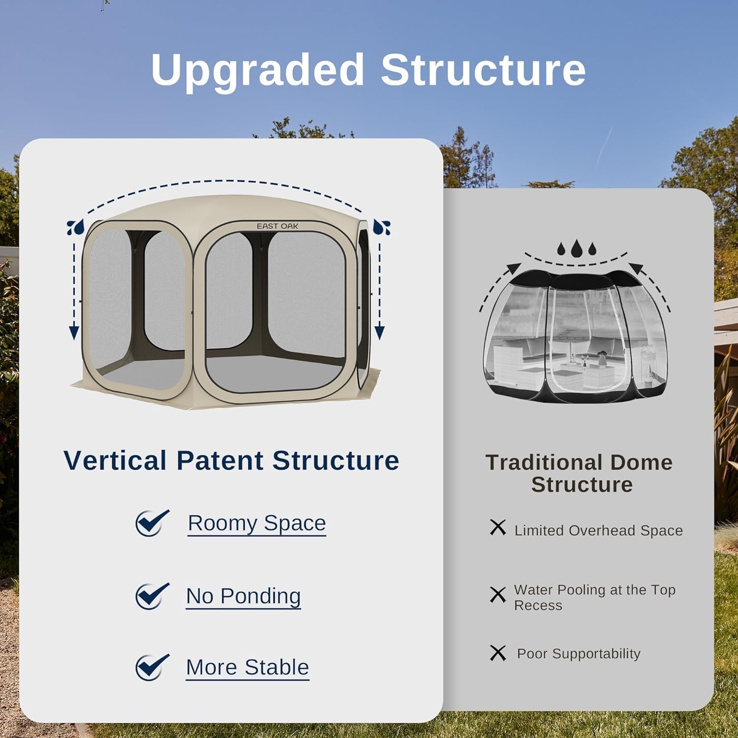 - ๐ฅ๐ผ๐ผ๐บ๐ ๐ฆ๐ฝ๐ฎ๐ฐ๐ฒ and ๐จ๐ฝ๐ด๐ฟ๐ฎ๐ฑ๐ฒ๐ฑ ๐๐ฒ๐๐ถ๐ด๐ป: The top structure is supported by heavy-duty fiberglass, which prevents water from accumulating and delivers more space. The zipper can be used on both sides, and its connection with the tent is upgraded with doulble stitching, making it less likely to tear. The door curtain can befixed to the side for easy access