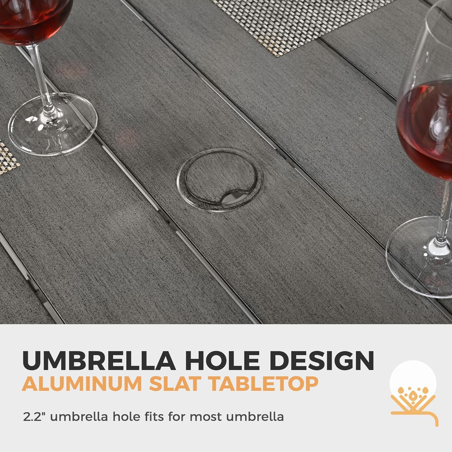 - 2.2" Umbrella Hole Design: The outdoor dining table features a 2.2" umbrella hole integrated into the tabletop, providing shade on sunny days or protection from heavy rain. This can be especially useful for outdoor dining or gatherings, allowing you to enjoy your time outside without being affected by the weather.