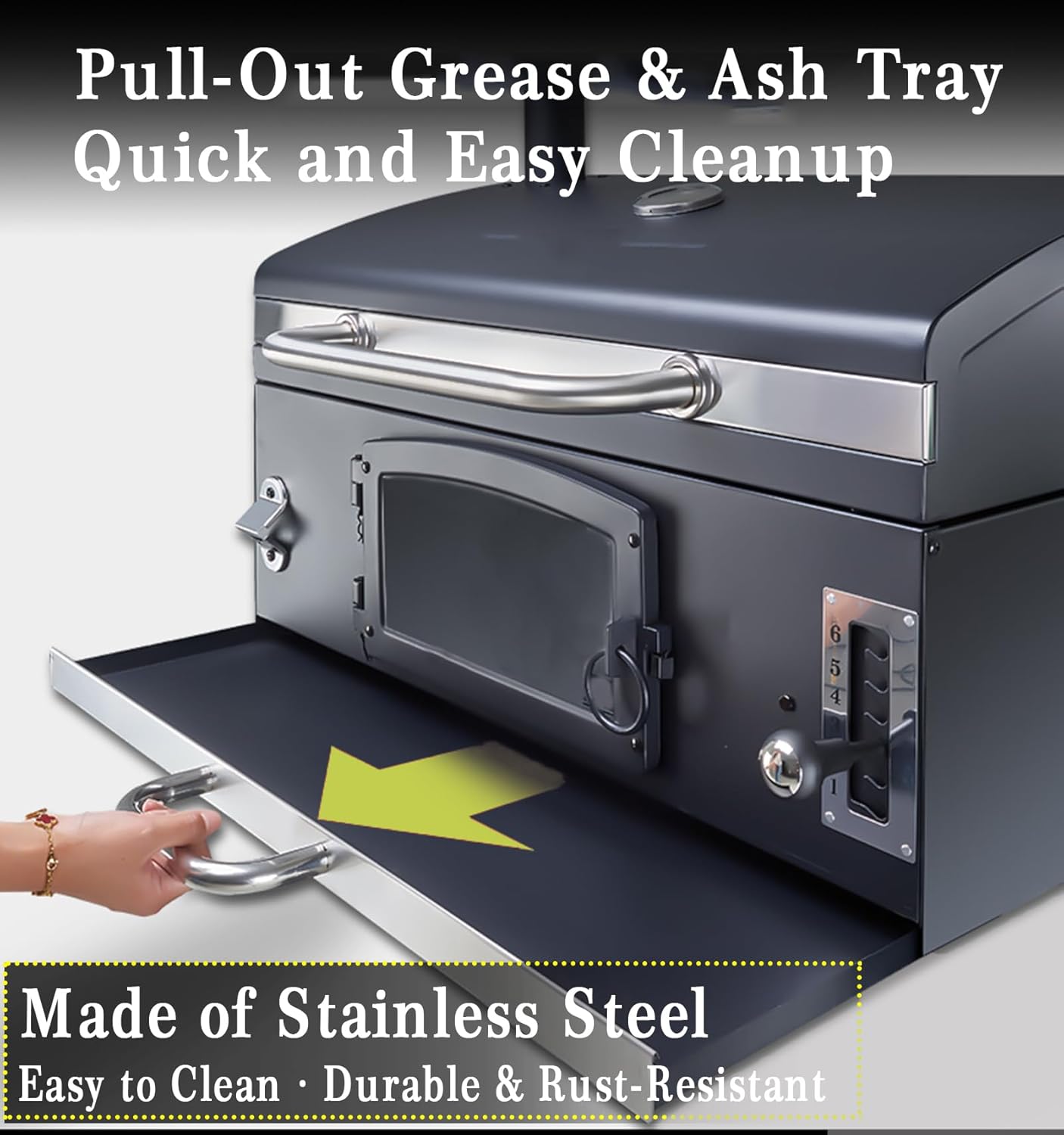 - Easy Charcoal Access Door & Ash Tray : This bbq charcoal grills has individual doors with cool-touch metal handle on the front cover where you can add fuel (or re-arrange the hot coals) while cooking without having to move the food or remove the grills. Hassle-Free Cleaning with Slide-Out Ash & Grease Tray Built-in stainless steel drawer-style drip tray collects grease and ash for quick and easy cleanup after every cookout.