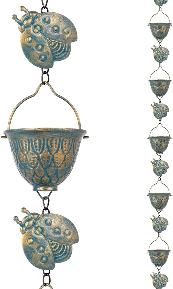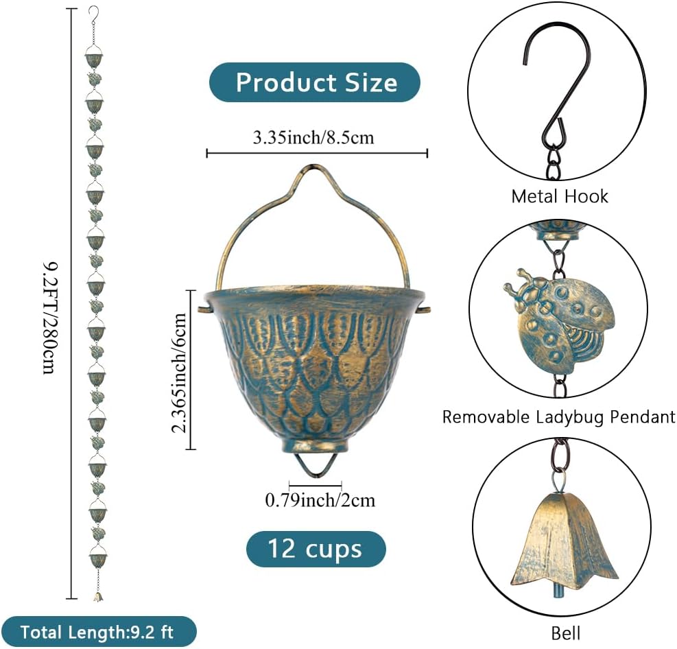 - Functional Alternatives: The metal rain chain consists of 12 cups with removable ladybug decor that you can choose to install or not depending on your preference. Full length is 9.2 FT and fitting for single story standard construction. An elegant alternative to traditional downspouts and it will add a chic touch to your roof