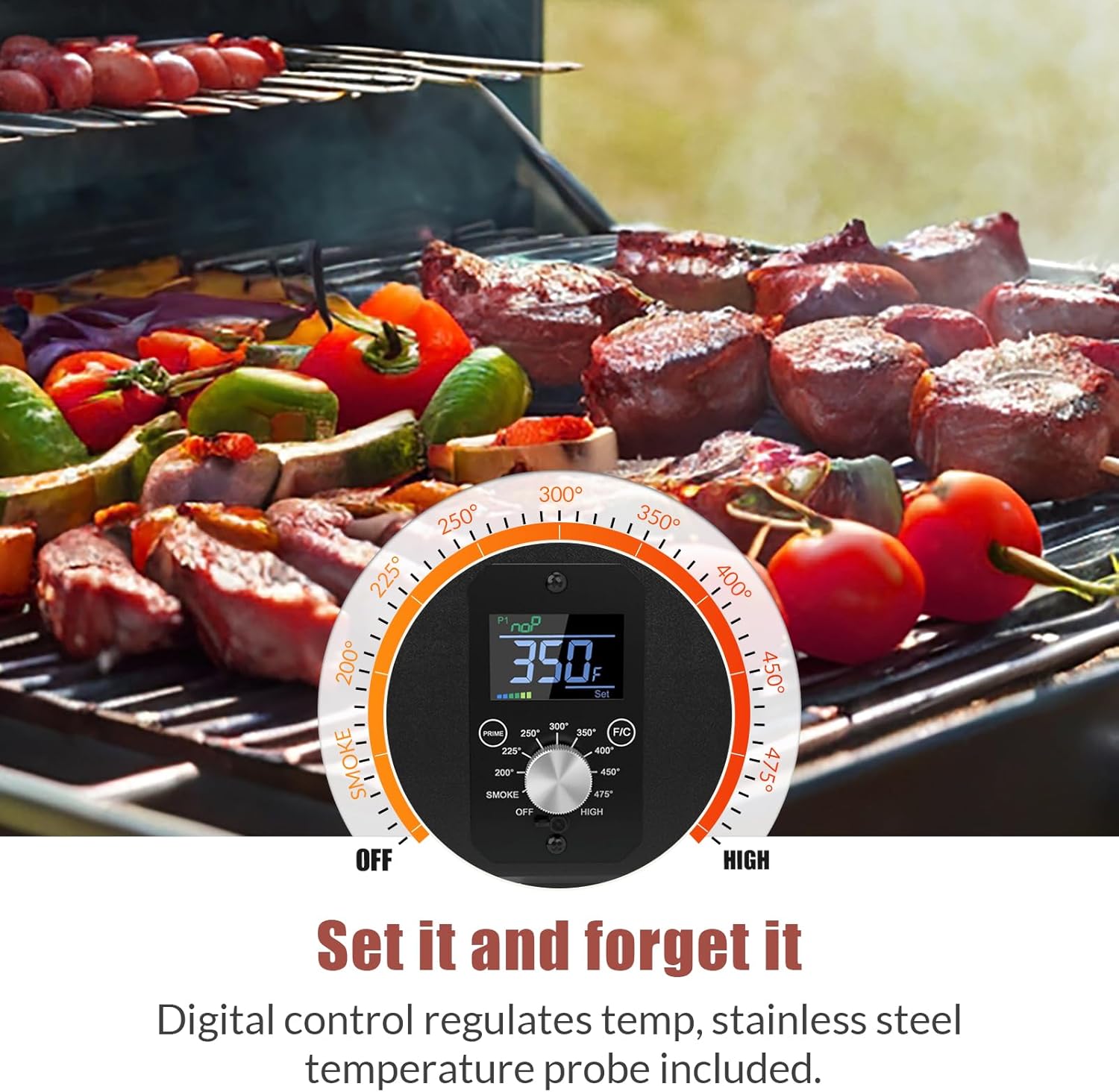 - 【Smart Digital Control with ±5°F Accuracy 】: Auto-adjusts pellet feed to maintain 180°F-500°F (smoke/low/med/high) via knob. Dual-layer metal plates heat 40% faster & hold 27% more heat (lab-tested). Stable 3% temp fluctuation for 12+ hrs slow cooking. Portable yet outperforms commercial grills.
