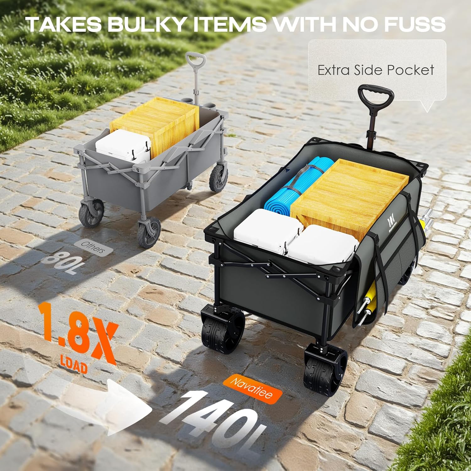 - BUILT TO LAST WAGON : Built with durability and sustainability in mind, our beach wagon comes with a high-strength steel frame and durable 600D oxford fabric. Solid frame construction wonβt buckle or lose shape. With a winning combination of performance, style and build quality, Navatiee wagons bring relaxation and joy to wagon users around the world.