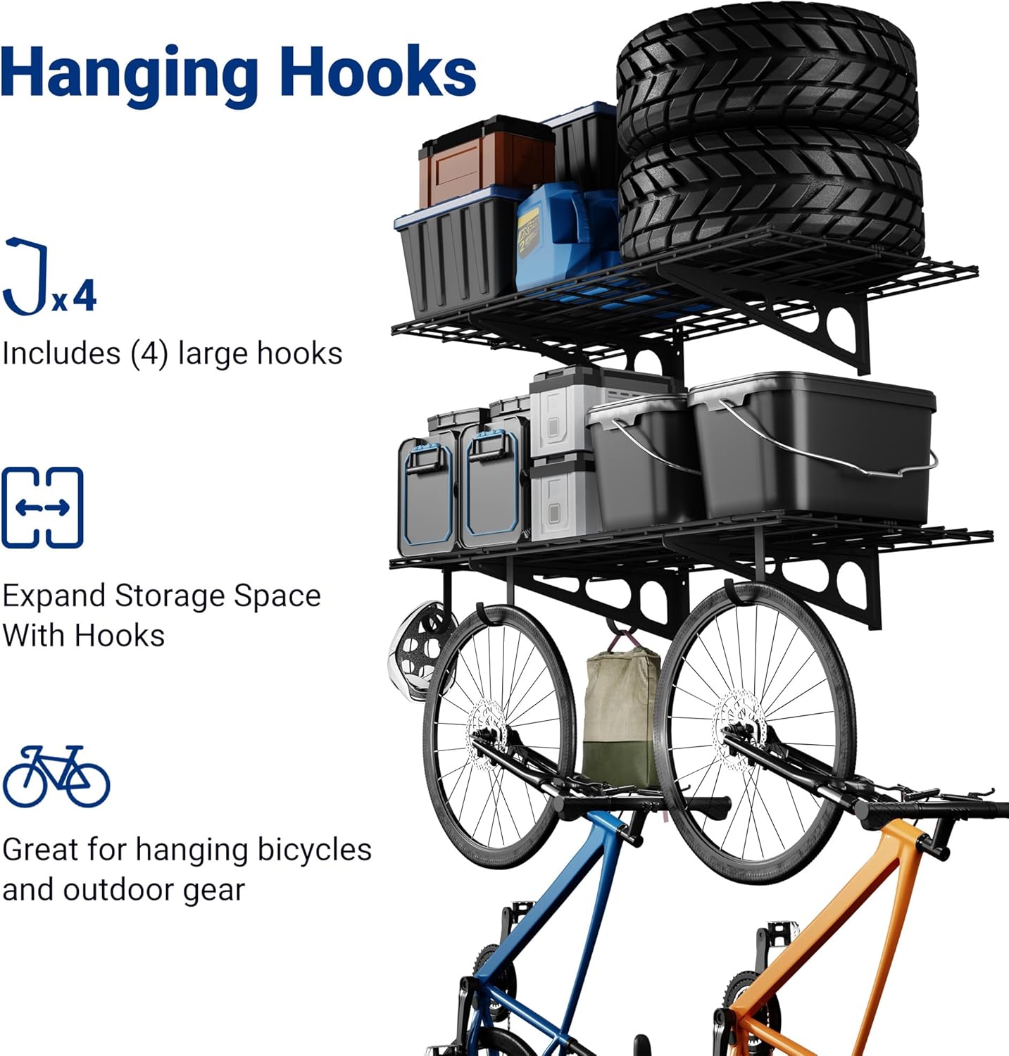 - High Load Capacity: The shelving can safely hold a total load of 400 lbs (200 lbs per tier). Each hook can safely hold 50 lbs.