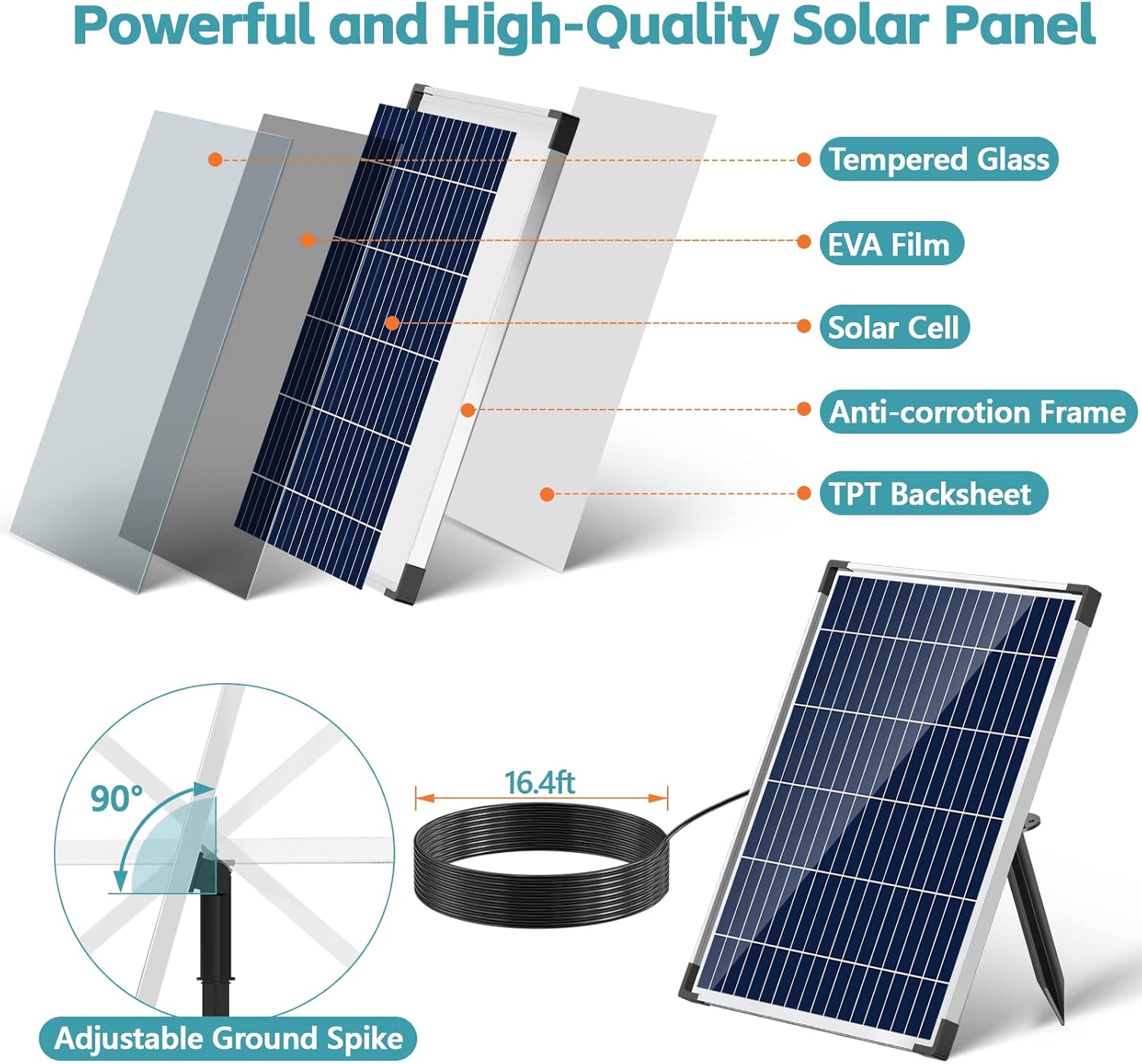 - [✔ High Efficiency and Long Life] Our solar fountain pump are made with 12W high-quality solar panel which provides more efficient and longer service life than traditional solar panels, allows the solar pump works continuously and stable. Comes with 16.4ft long cord allowing to find the best place to place solar panel.