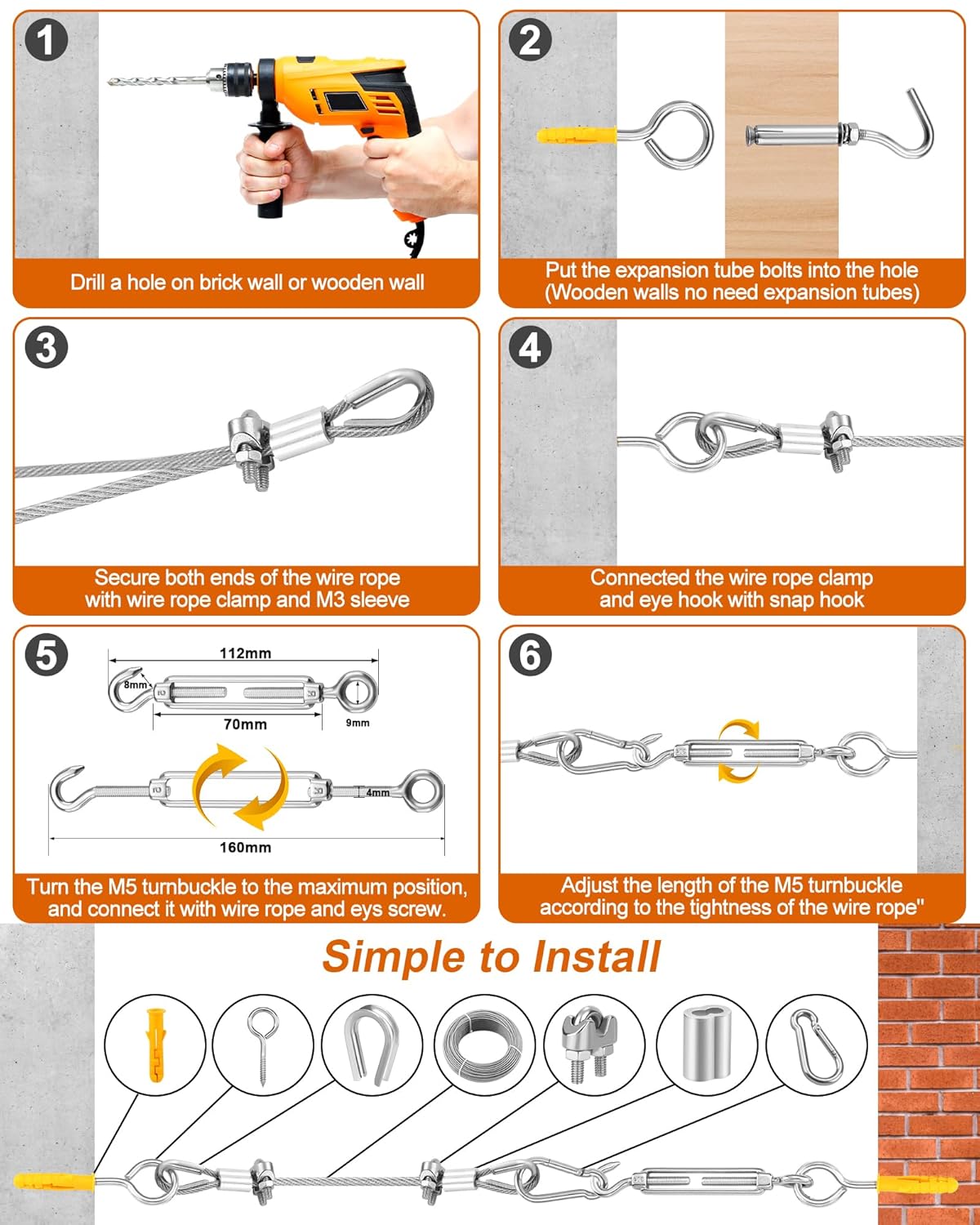 - [Versatile Applications] Premium coated stainless steel cable with adjustable turnbuckle tensioners and versatile hooks and anchors ensure safety, stability, and weather resistance for any occasion. Whether you’re setting up an outdoor tent, creating decorative rope displays, or hanging party lights, our wire rope kit has you covered. It’s perfect for outdoor string lights hanging, festival decorations, clotheslines, fences, plant traction ropes, and even picture displays in your backyard