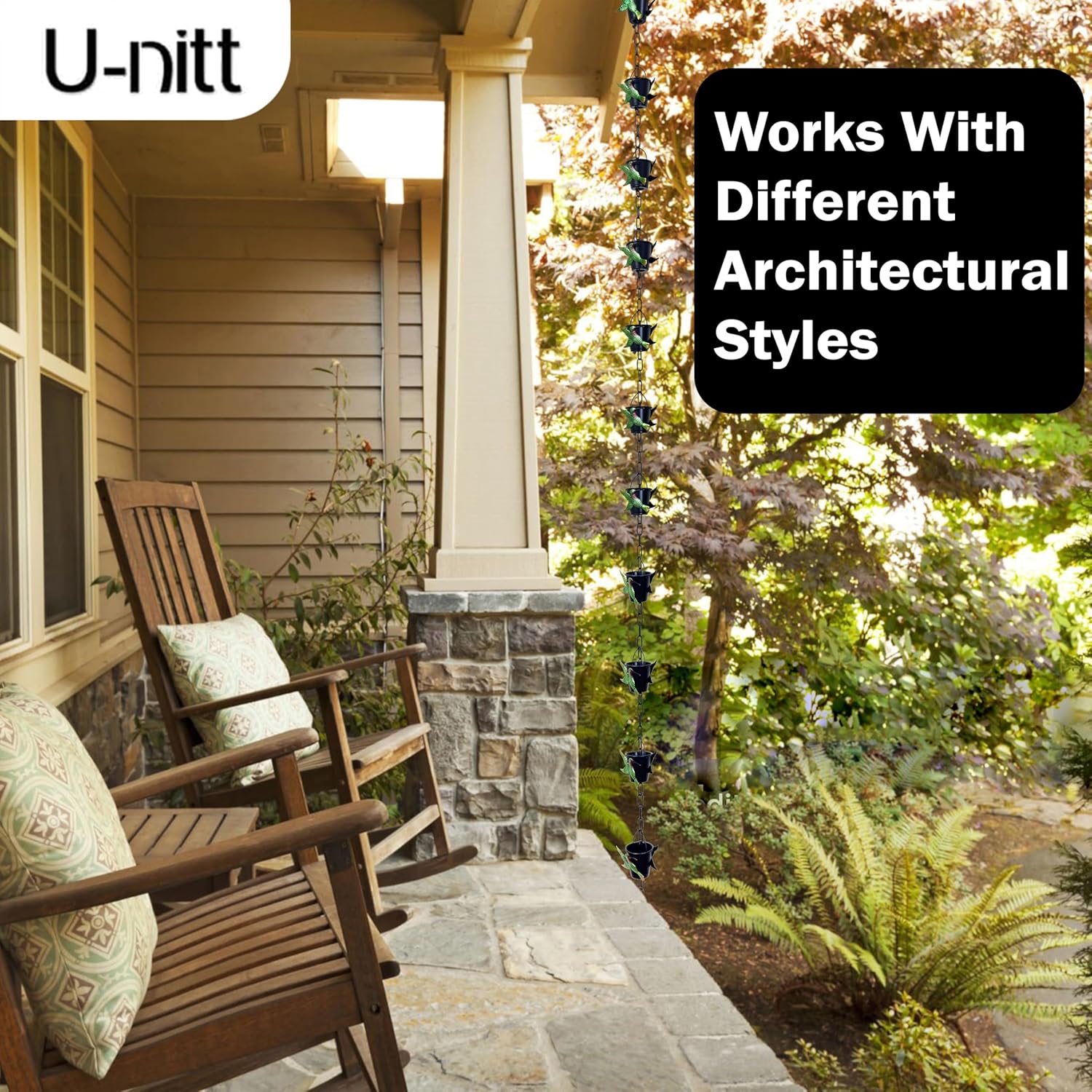 - SUPERIOR CRAFTSMANSHIP - is evident in every detail of this expertly designed U-nitt rain chain. Meticulously crafted from premium, heavy-duty materials, it offers both durability and elegance. Each link or cup is precision-shaped to ensure smooth water flow, effectively guiding rainwater from your gutter in a graceful cascade. Rust-resistant and built to last, this rain chain blends functionality with artistry, adding a refined touch to your homeβs exterior while enhancing rainwater management.