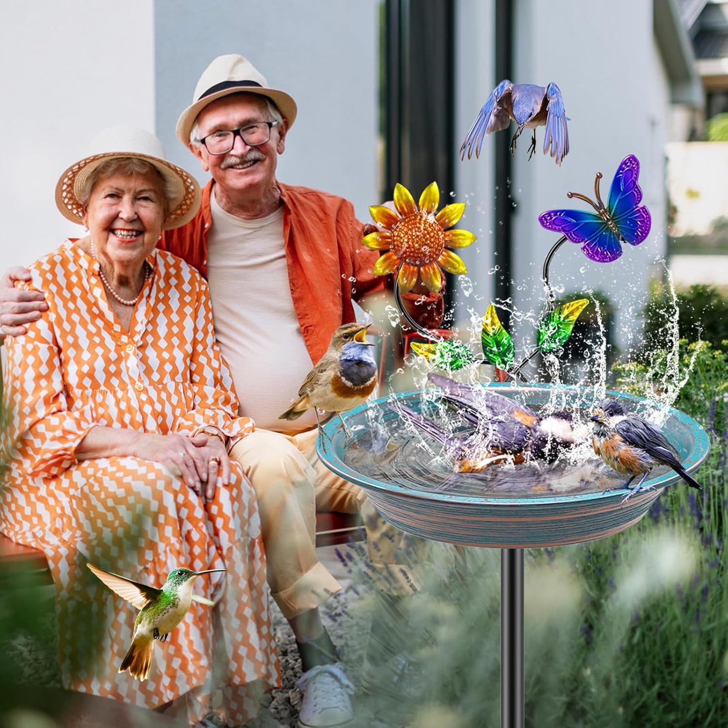 - Beautiful Garden Decor:The metal bird bath adds removable sunflower and butterfly decor for added beauty. The vintage finish coating allows the birdbath to display a silky, beautiful metallic sheen when exposed to sunlight. Add an extra splash of beautiful color to your garden