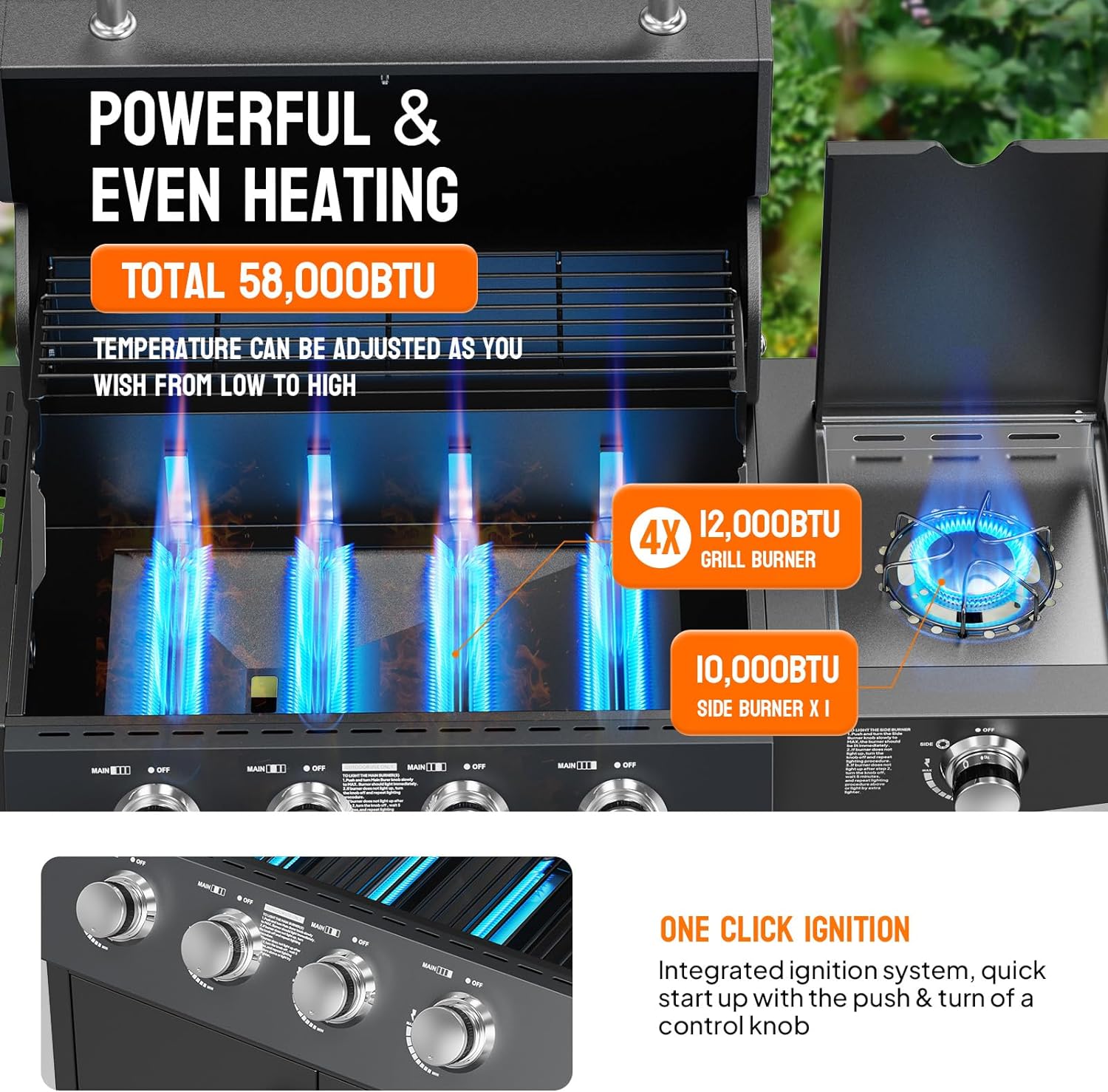 - đ„ăPowerful HeatingăThis propane grill is equipped with 4 independent stainless steel grilling burners and 1 side cooking burner, which provide a total 58,000 BTU of cooking power including 48,000BTU grilling burners and 10,000 BUT side burner. And you can adjust the flame size as needed, providing a variety of cooking options. Whether it's cooking eggs, pancakes, grilling cheese, or steak, you can do it all with ease