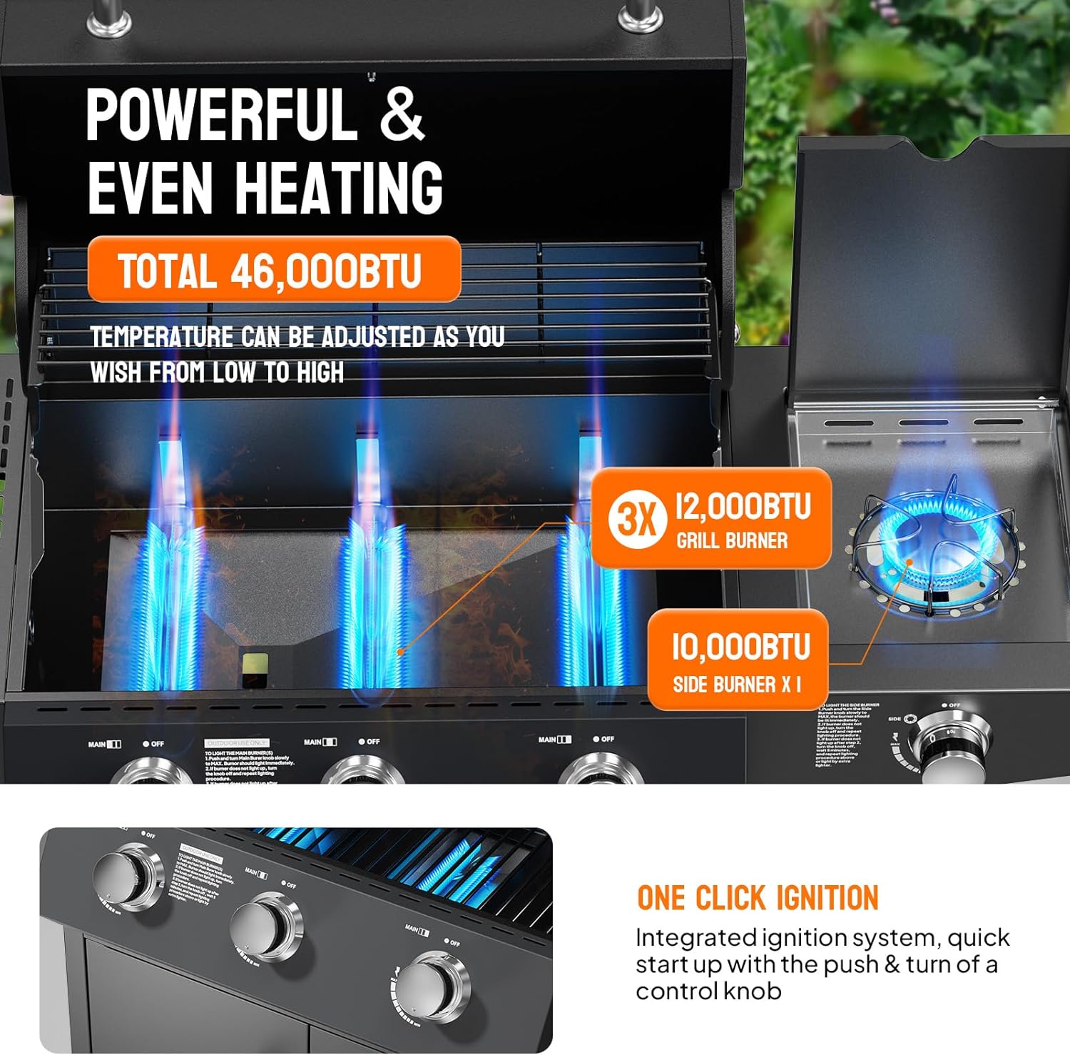 - đ„ăPowerful HeatingăThis propane grill is equipped with 3 independent stainless steel grilling burners and 1 side cooking burner, which provide a total 46,000 BTU of cooking power including 36,000BTU grilling burners and 10,000 BUT side burner. And you can adjust the flame size as needed, providing a variety of cooking options. Whether it's cooking eggs, pancakes, grilling cheese, or steak, you can do it all with ease